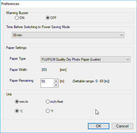 Ниже задается тип бумаги из трех возможных (на картинке в инструкции можно разглядеть еще два типа, но у нас подобного не было), отображается ее ширина (она считывается из самого принтера) и остаток в рулоне — его значение в метрах нужно вводить в соответствии с действительностью. Когда рулон «непочатый», это сделать легко: 65 метров, такое значение будет установлено по умолчанию при каждой смене (так написано в инструкции, но у нас это происходило не всегда), а если рулоны часто меняются, то при извлечении придется фиксировать реальный остаток для каждого и при установке его обратно в принтер вводить вручную.