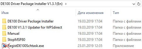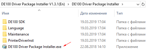 Инструкция требует запускать файл DE100 Driver Package Installer V1.3.1(En)\DE100 Driver Package Installer\DE100 Driver Package Installer.exe:
