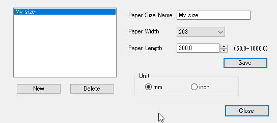 Ширина здесь также выбирается только из ряда реально доступных, а вот длину можно задать в очень широких пределах — от 5 до 100 см, причем с точностью до 0,1 мм. Такой установке можно задать внятное имя, которое появится в выпадающем списке Paper Size.