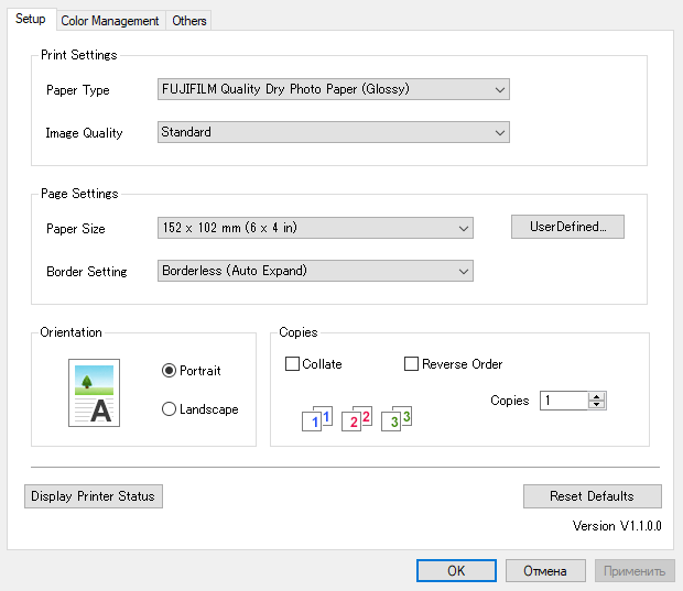Почему-то в списке форматов, имеющемся в настройках драйвера, отсутствует стандартный для фотобумаги размер 15×21 см, нам пришлось сделать его как User Defined.