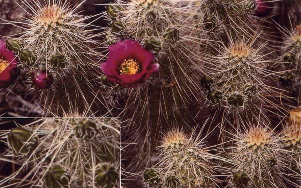 Данный снимок содержит множество мелких деталей, в нем сочетаются теплые, холодные и нейтральные оттенки. Справа приведен участок с увеличением, на котором видна фактура тиснения бумаги.