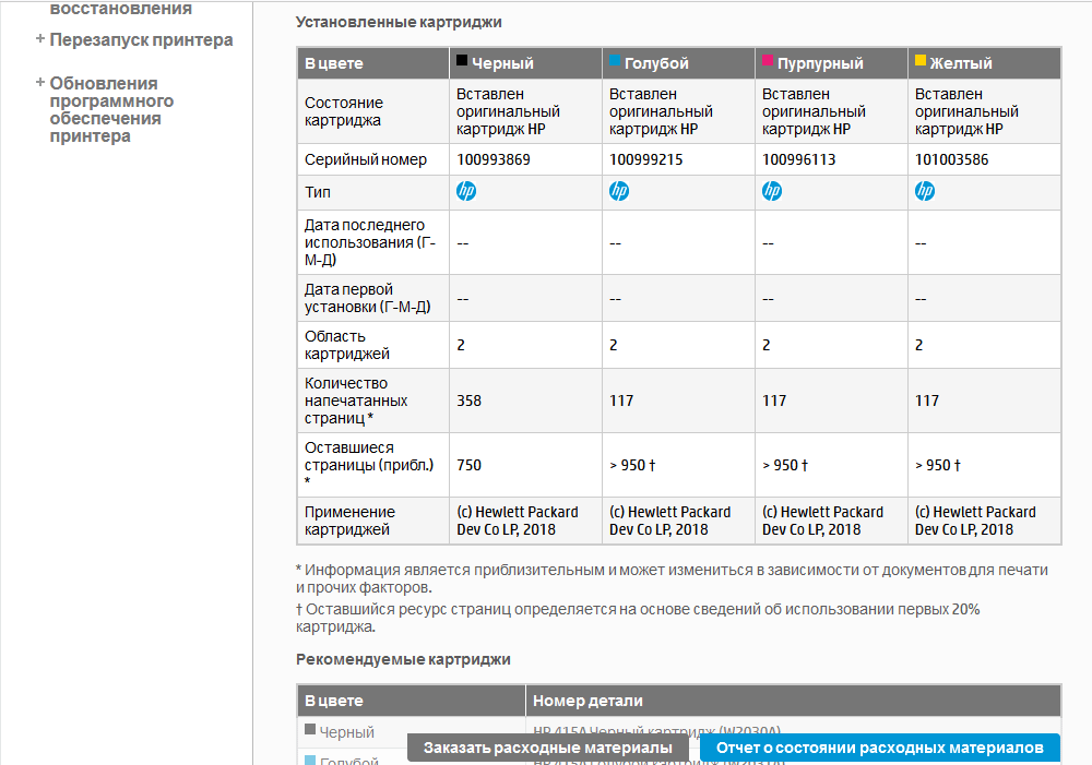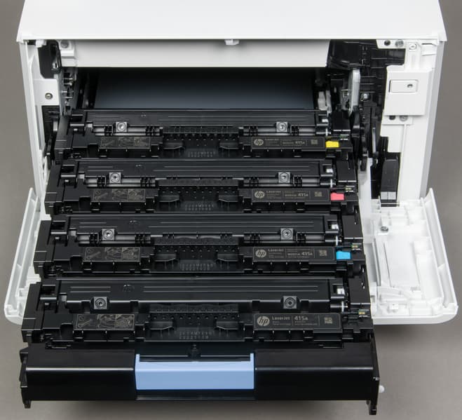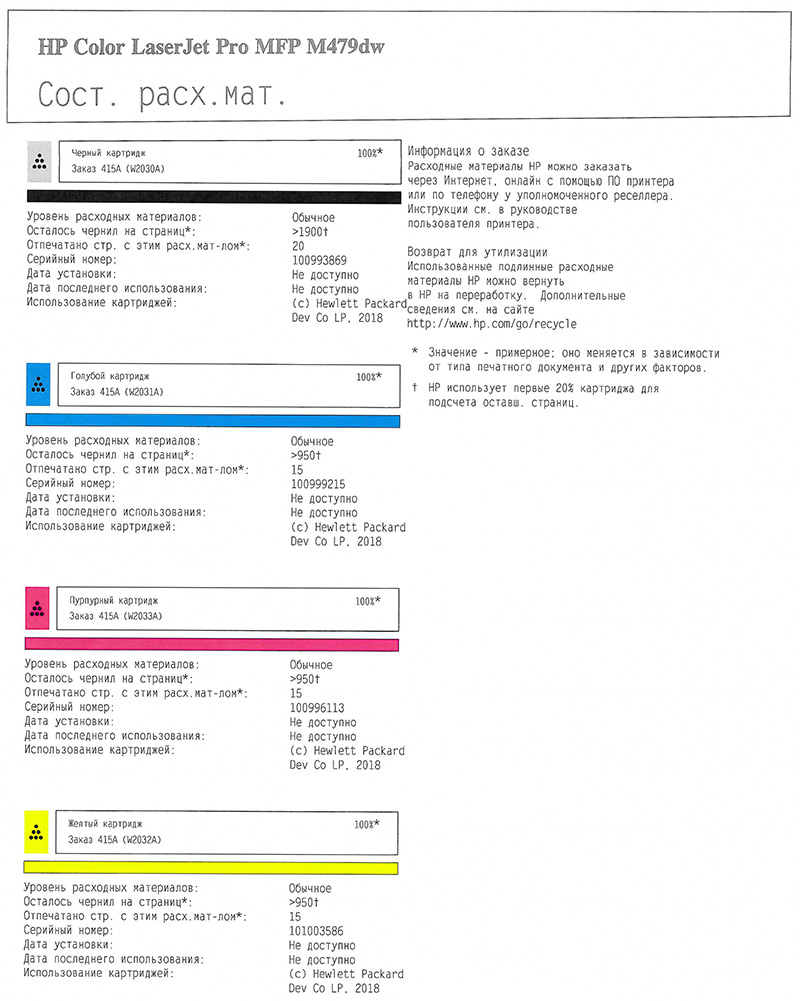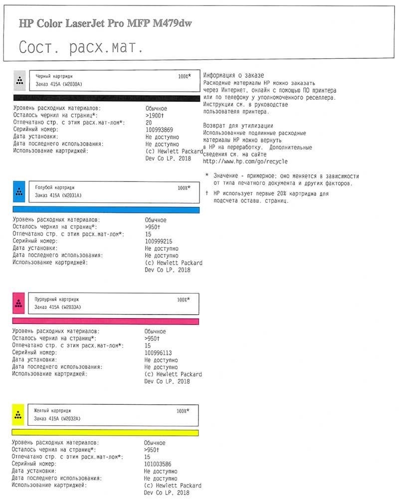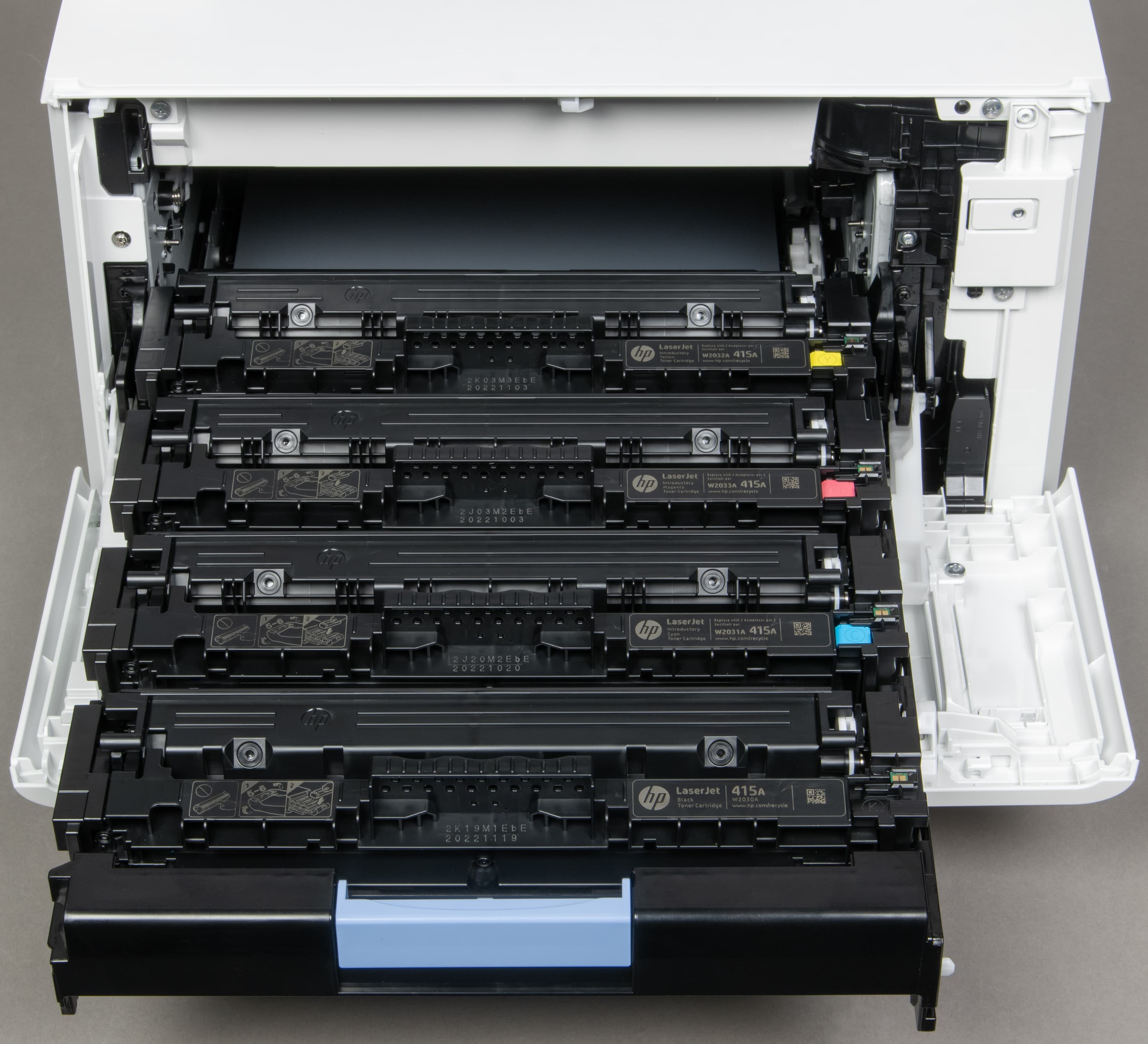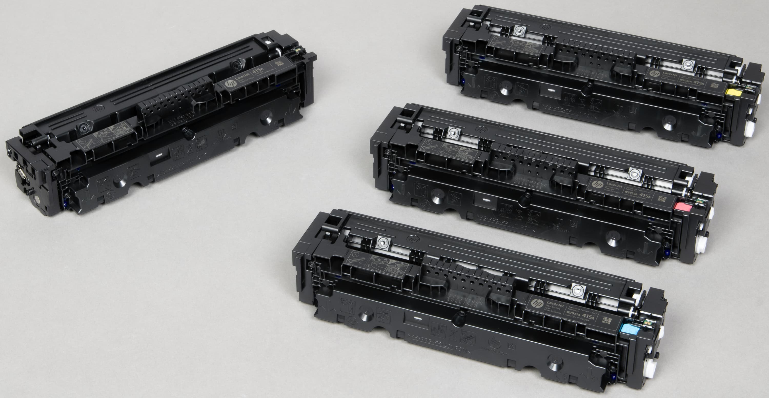 - HP LaserJet 415A с добавлением цвета: Black W2030A на 2400 отпечатков, а также Cyan W2031A, Magenta W2033A, Yellow W2032A на 2100 отпечатков каждый (такие поставляются в комплекте МФУ);