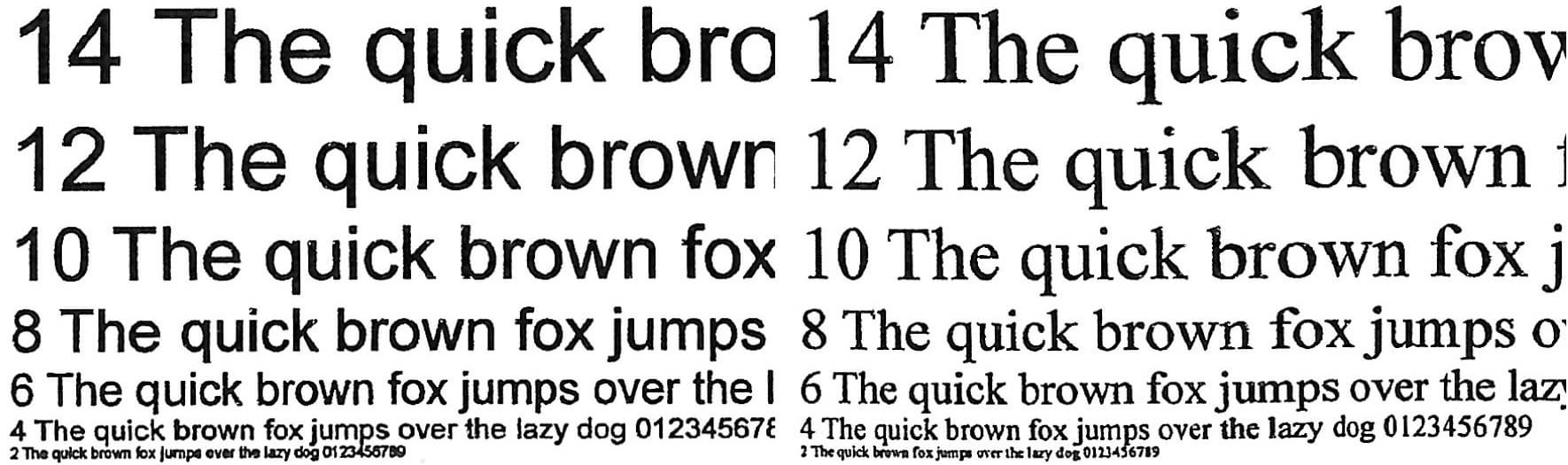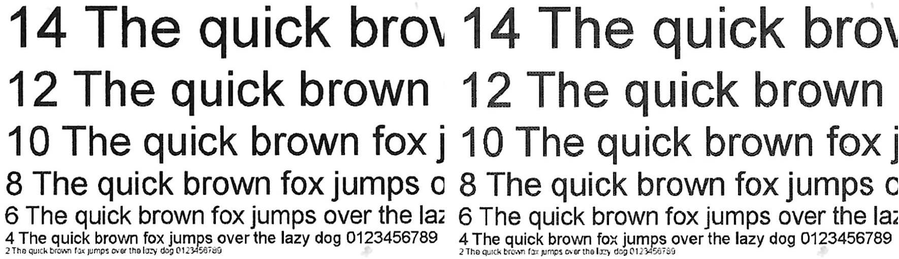 При работе с компьютера драйвер PCL6 для монохромной печати имеет две установки: «Только черный» (используется только черный картридж) и «Высококачественный CMYK-серый» (используются все картриджи). В обоих случаях передача текстовых образцов получается очень хорошей: разборчивость начинается с 4-го кегля как для шрифтов без засечек, так и с засечками, с некоторым трудом можно прочитать даже 2-й кегль без засечек (с засечками практически не читается); контуры букв четкие, заливка плотная, растр сложно заметить даже при сильном увеличении.