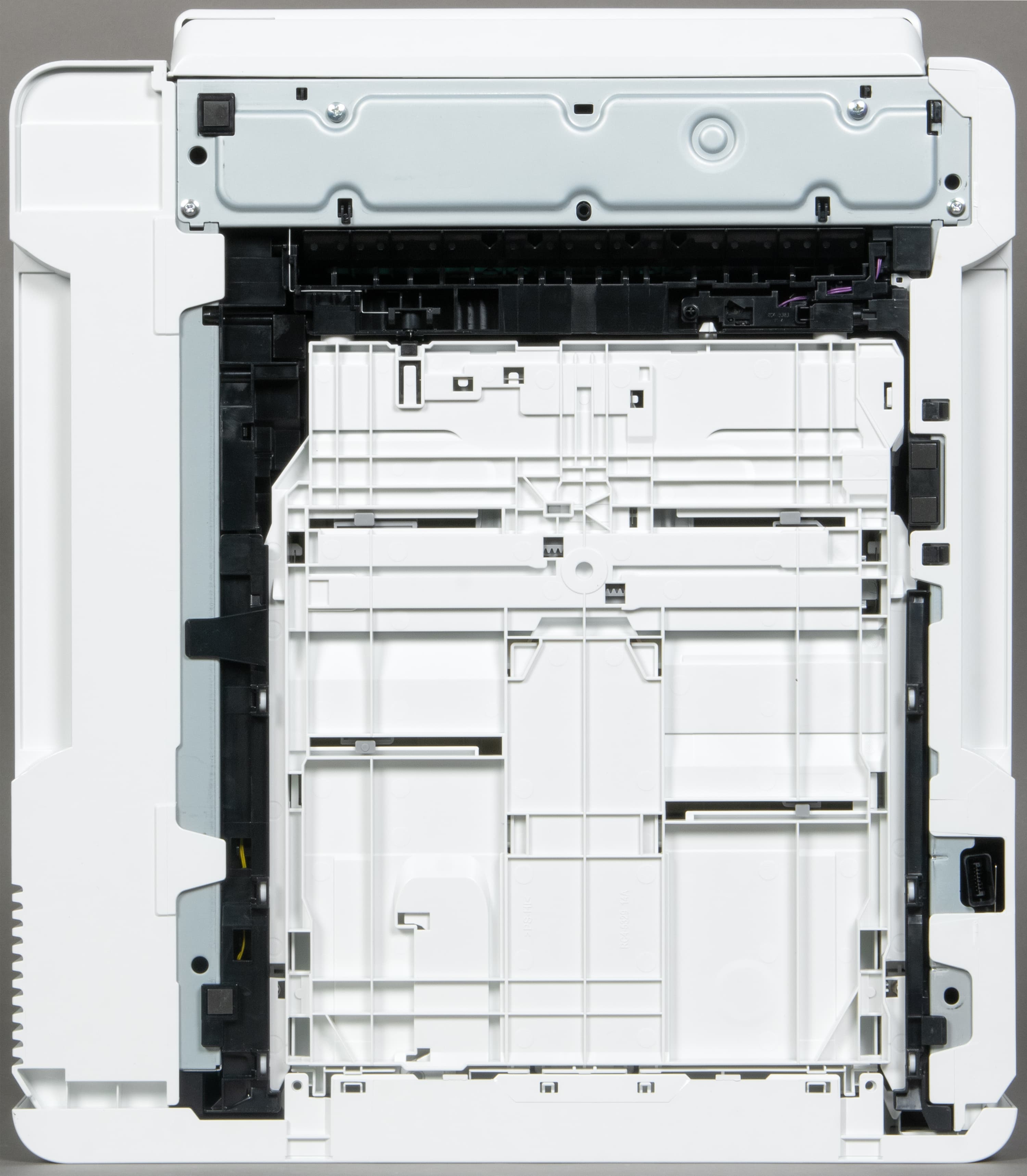 Почти всю площадь задней стенки занимает откидная крышка тракта подачи бумаги, вокруг нее — различные разъемы.