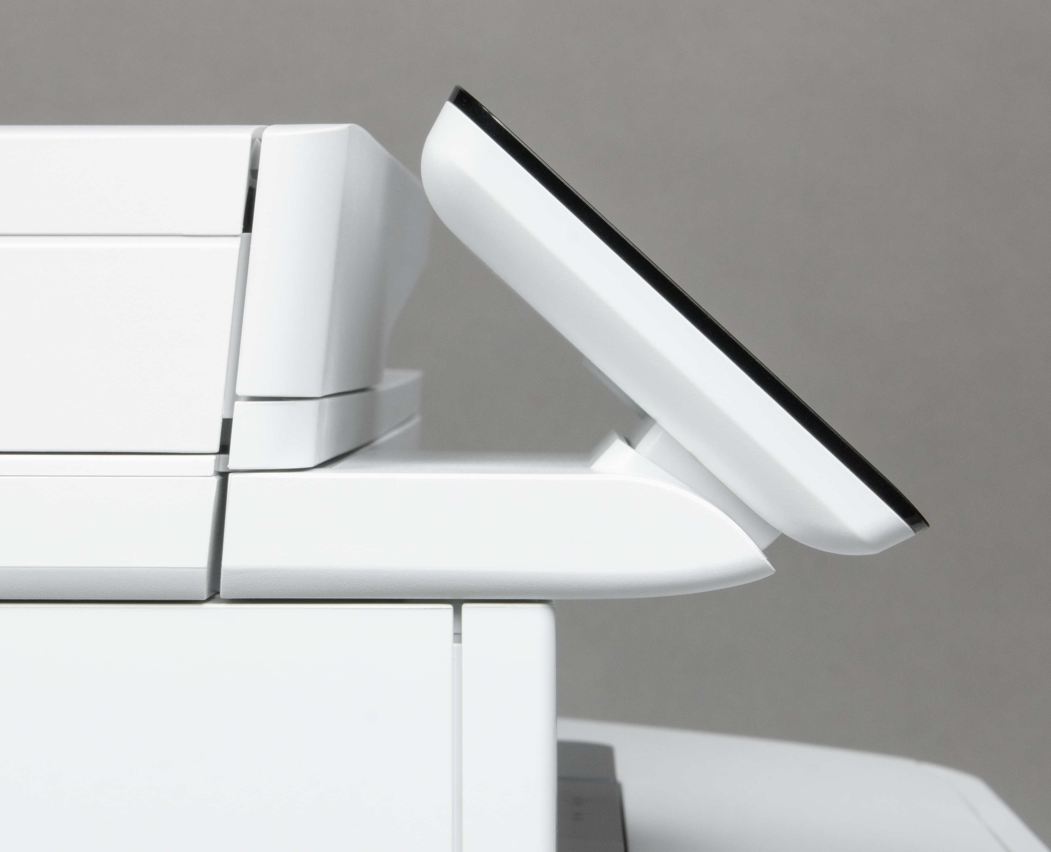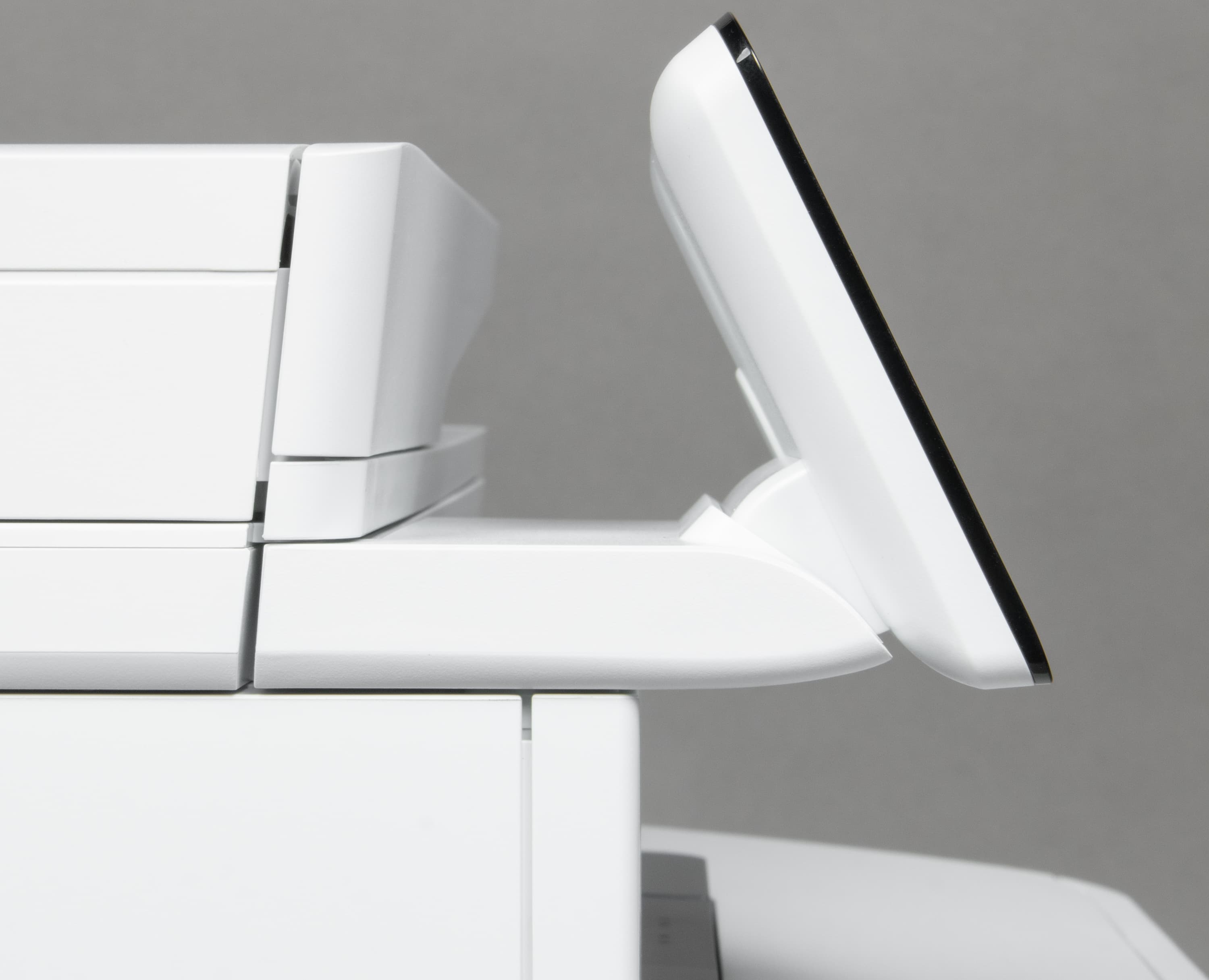 Слева от приемного лотка находится панель управления, оснащенная шарниром, позволяющим менять угол наклона панели — немного, градусов на 25-30, но это заметно повышает удобство работы для оператора практически любого роста и из любого положения, стоя или сидя.