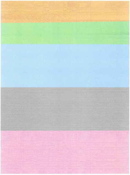 Отпечатки такого типа при установках в драйвере PCL6 по умолчанию получаются хорошо: каких-либо полос на сплошных заливках нет, сами заливки плотные и равномерные, цвета насыщенные, текст читается нормально. Есть некоторые претензии к цветопередаче.