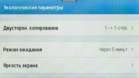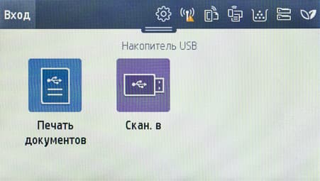 «Домашняя» страница экранного меню по умолчанию состоит из трех частей. Самая крупная — средняя, с горизонтальной прокруткой, на ней находятся иконки основных режимов: копирования, сканирования, печати, а также некие «Приложения», при подключении флешки к фронтальному разъему появляется еще один соответствующий значок. В модификациях M479fnw и M479fdw добавляется иконка работы с факсимильными сообщениями. Для этого поля возможна горизонтальная прокрутка.