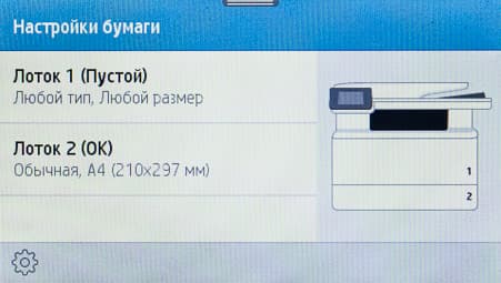 В нижней части печатающего блока находится выдвижной лоток (его номер 2) для подачи бумаги, вместимость до 250 листов. Над ним второй подающий лоток, откидной универсальный (помечен номером 1), рассчитанный на 50 листов.