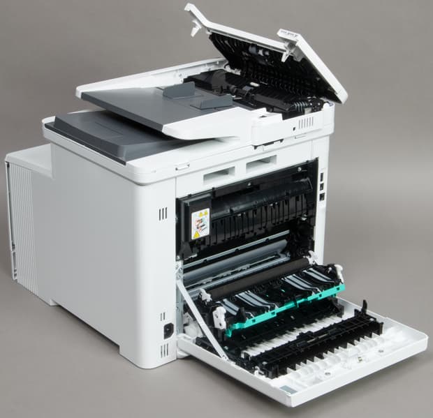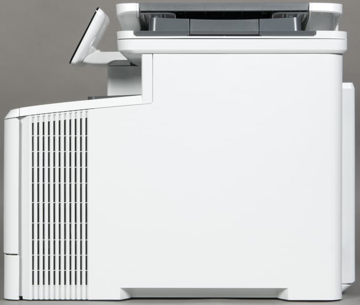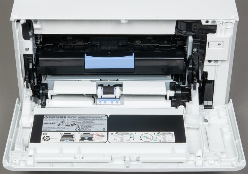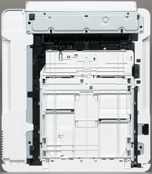Универсальный лоток закреплен на еще одной откидной крышке, которая открывает доступ к внутренним частям принтера, включая выдвижную кассету для картриджей.