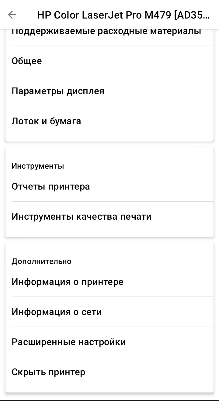 Единственная опция — дополнительный лоток CF404A вместимостью 550 листов (плотность не указана, но надо полагать, что речь про офисную бумагу 80 г/м²), диапазон плотностей носителей 60—163 г/м². Его вес 4,8 кг (естественно, без учета бумаги), а размеры 407×447×154,6 мм, то есть установка увеличит высоту устройства примерно на 15 см.