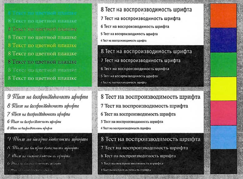 На текстовых полях при печати нормальной и вывороткой шрифты с засечками и без читаются от 4-го кегля, декоративный шрифт реально читается с кеглем от 5-го нормальный и от 7-го вывороткой. И даже цветной текст на зеленой плашке выглядит неплохо, исключая лишь синий шрифт.