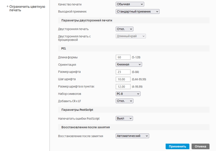 Одностороннюю печать мы опробовали на бумаге с плотность 220 г/м² и установкой «Бумага HP для брошюр, глянцевая, 200 г» — семь листов отработаны нормально, проблем с запеканием тонера нет, но скорость печати существенно меньше, чем с обычной бумагой. Для дуплекса взяли бумагу 200 г/м² (установка та же), пять листов с двух сторон отпечатаны без застреваний.