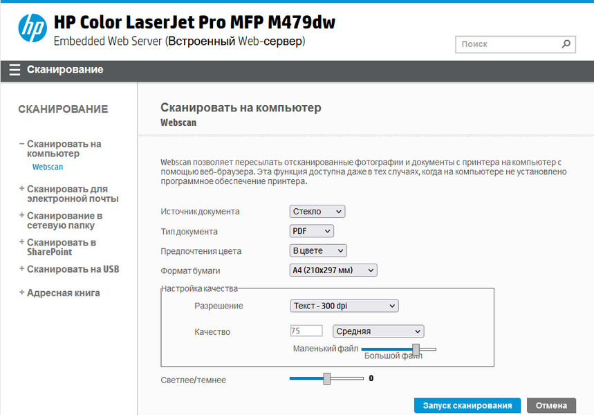 При сканировании на флешку или с локально подключенного компьютера процесс идет непрерывно и быстро, скорость хоть и меньше заявленных «до 29 / 20 стр./мин. (моно/цвет)», но разница не критическая. От установок зависимость понятная: чем больше объем полученной при сканировании информации, тем ниже скорость.