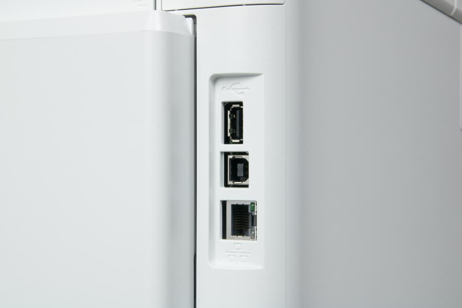 Ближе к левому боку расположен набор портов: Ethernet и два USB 2.0 — тип B для подключения к компьютеру и еще один тип А (в инструкции его назначение поясняется так: «для хранения заданий», об этом ниже).