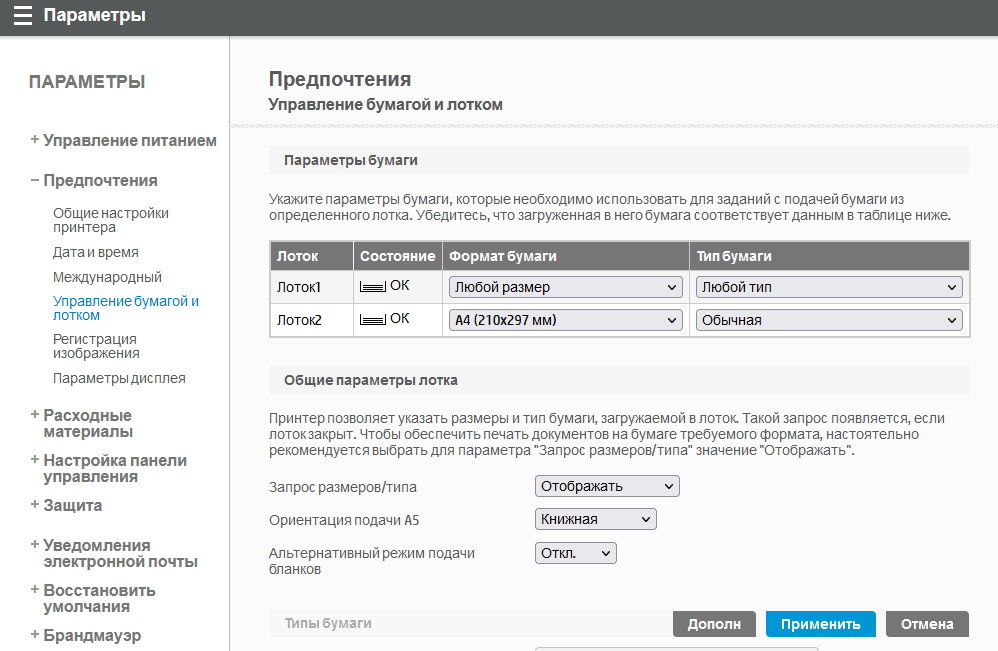 | Поддерживаемая плотность бумаги | выдвижной лоток: 60—163 г/м², универсальный лоток: 60—176 г/м², глянцевая бумага HP: до 200 г/м², дуплекс: 60—163 г/м² |