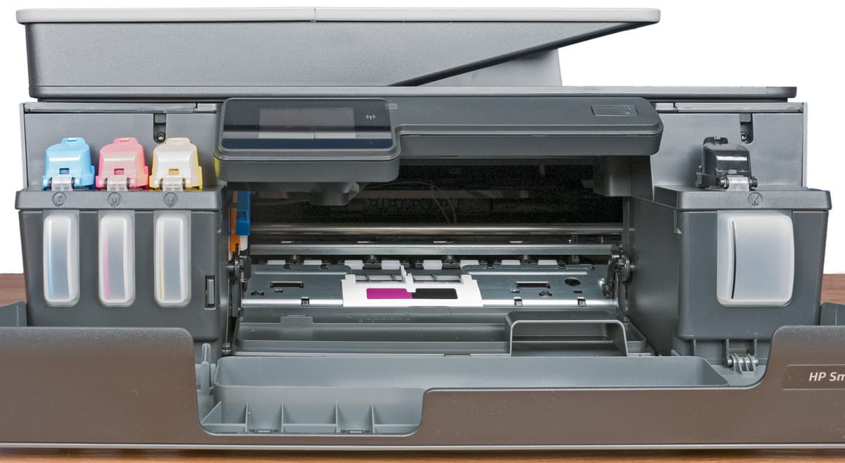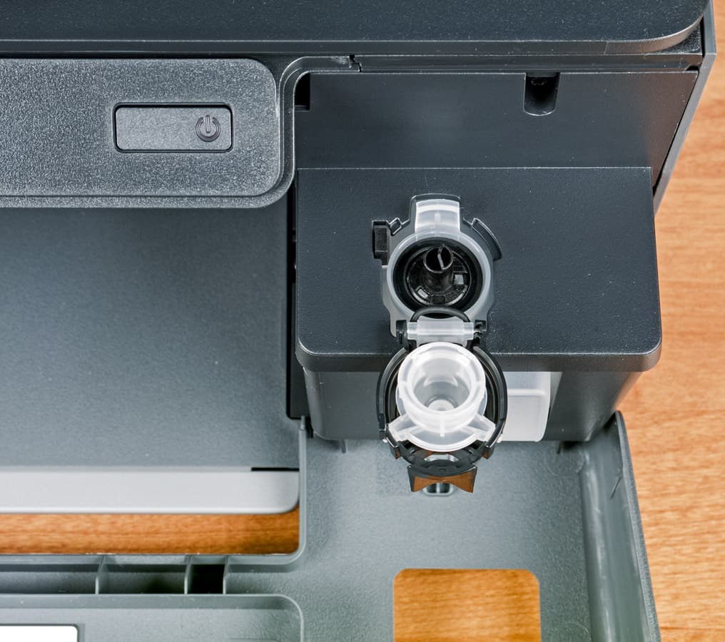 Все они являются струйными, причем вместо картриджей используются встроенные резервуары для чернил, то есть СНПЧ — системы непрерывной подачи чернил (производители принтеров и МФУ обычно не любят такой термин, и причина понятна: он давно и прочно ассоциируется с конструкциями той или иной степени кустарности, предназначенными для заправки неоригинальными расходными материалами).