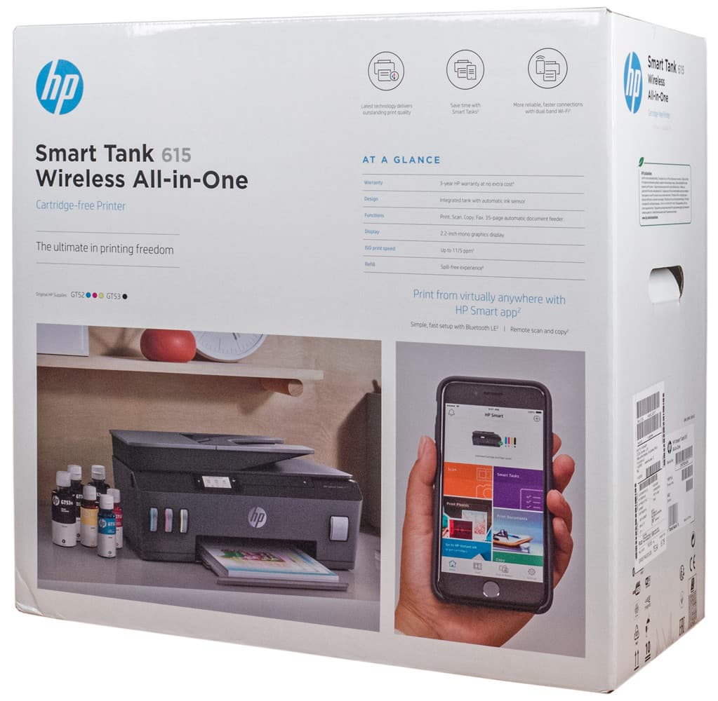 Мы рассмотрим многофункциональное устройство HP Smart Tank 615 Wireless All-in-One — таково полное официальное название модели, код продукта Y0F71A.