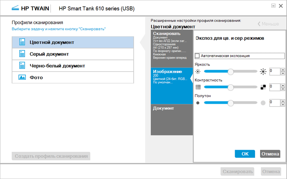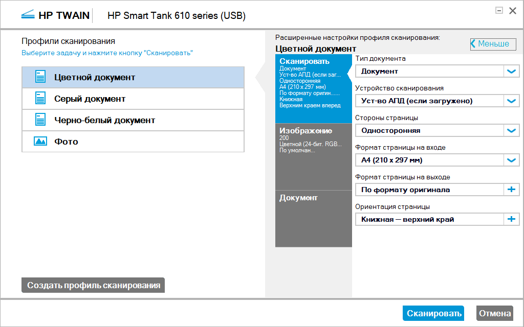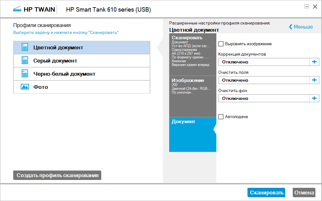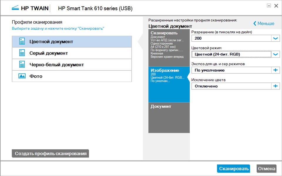 | Подключение, драйвер | Установки (тип оригинала для TWAIN — изображение, только для него разрешение задается прямо) | Время, мин:с |