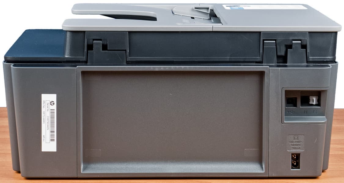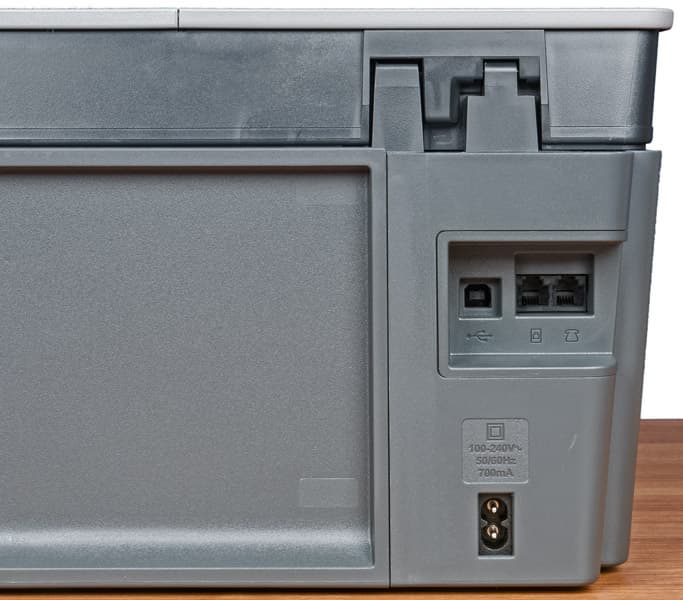 Все разъемы — для кабеля питания, телефонные и USB type B — расположены сзади, причем если интерфейсные порты находятся в нише заметной глубины, то гнездо питания практически не заглублено, поэтому вставляемый в него коннектор выходит за габариты принтера, однако он вполне вписывается в зону, определяемую выдвинутой опорой подающего лотка, а потому при установке достаточно оставить позади принтера 7-8 см свободного места.
