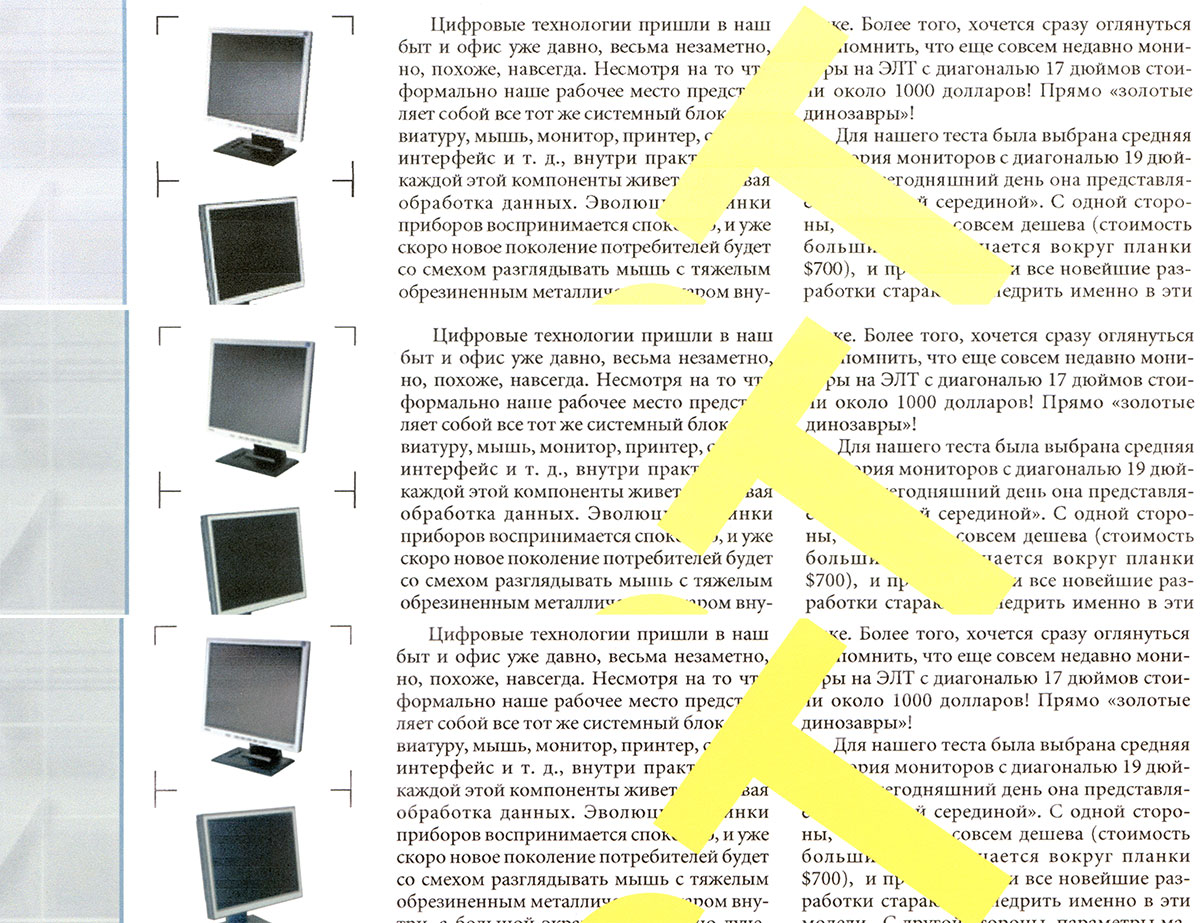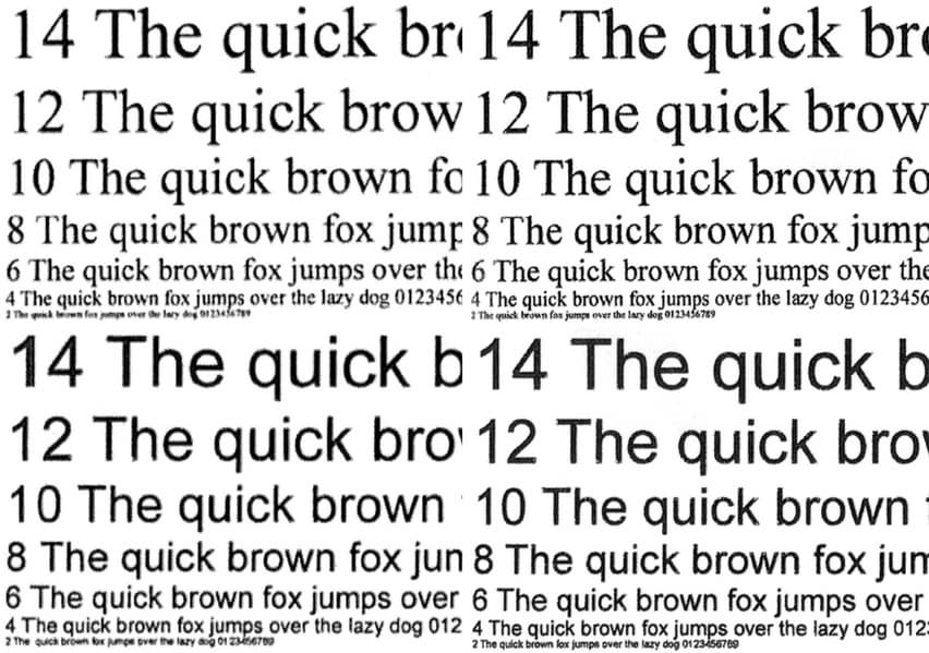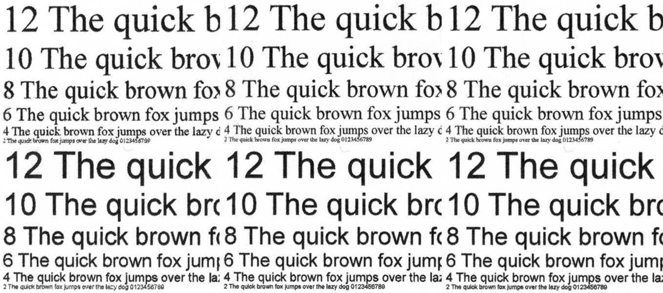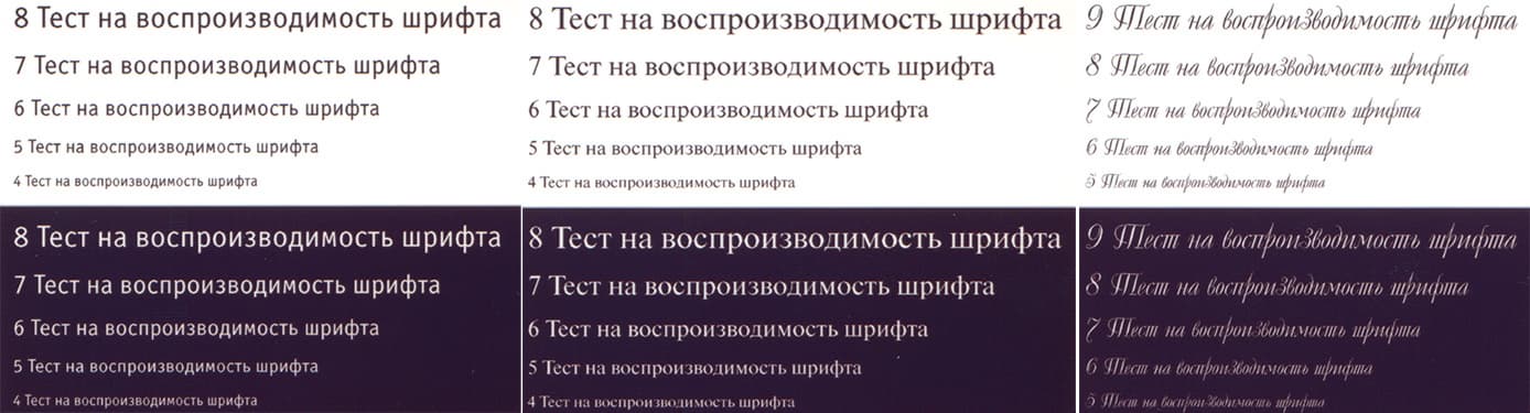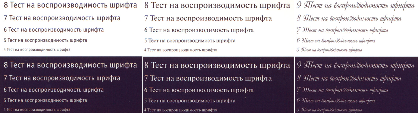 Текстовые поля также воспроизводятся весьма прилично: при печати нормальной и вывороткой шрифты с засечками и без читаются от 4-го кегля. Даже декоративный шрифт, который обычно передается существенно хуже, реально читается с кеглем от 5-го нормальный и от 6-го вывороткой.