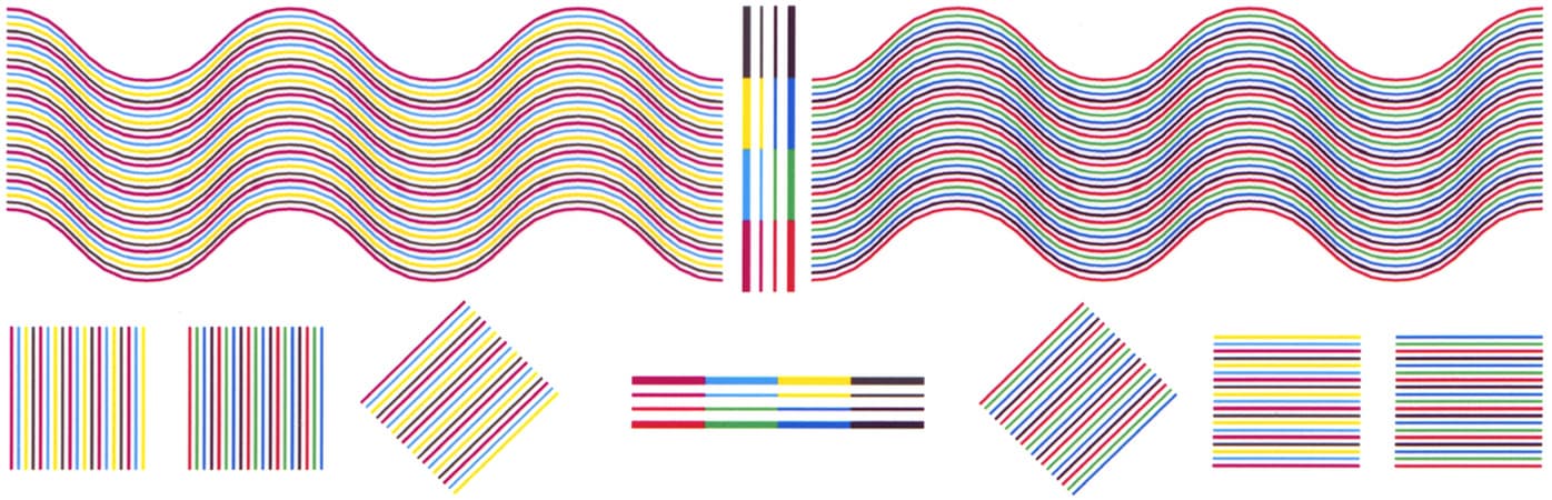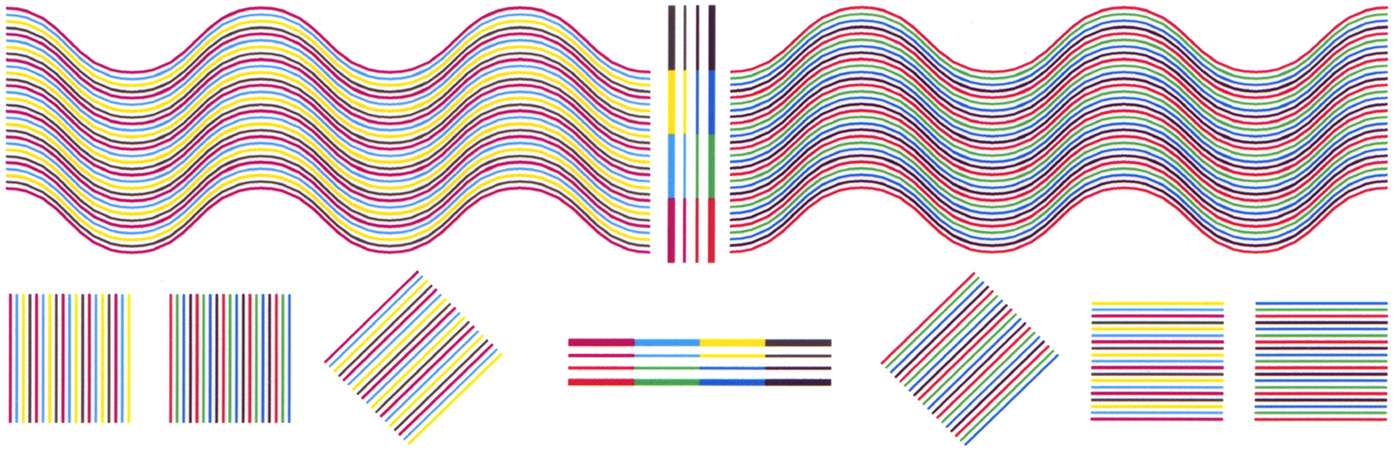 Совмещение цветов по обеим осям очень хорошее, тонкие линии воспроизводятся без заметных даже при увеличении разрывов и ступенек, на тонких изогнутых линиях нет перетеканий (конечно, с точностью до пористой структуры бумаги, которая сказывается на таких мелких деталях).