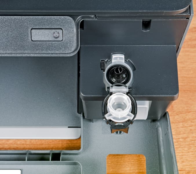 Фронтальная стенка аппарата целиком откидывается вперед (приемный лоток при этом задвигать не обязательно), открывая доступ к заливным горловинам встроенных резервуаров для чернил — трем цветным слева и черному справа.
