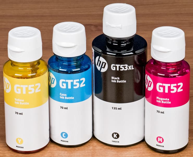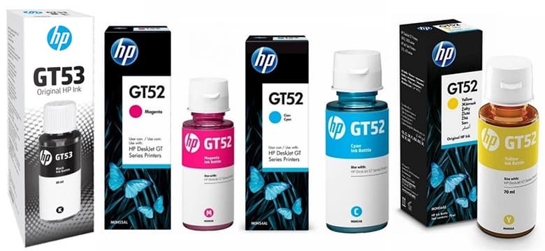 - цветные GT52 Cyan, Magenta, Yellow на основе красителя (или водорастворимые), емкость по 70 мл, расчетный ресурс 8000 отпечатков.
