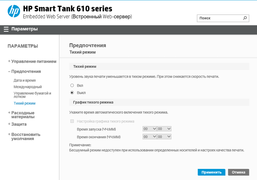Как и у большинства струйных принтеров, наиболее заметным по громкости является момент энергичной подачи бумаги. В тихом режиме подача происходит более плавно, что существенно снижает пиковые уровни; прочие шумы также становятся менее интенсивными за счет снижения скорости печати, однако эффект уже не столь заметный.