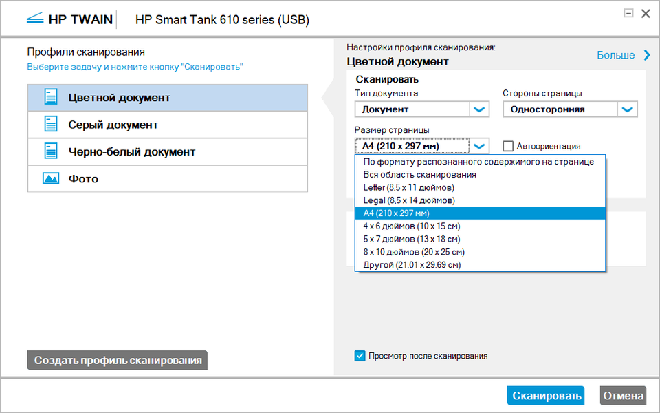 Еще замечание: для WIA при использовании автоподатчика по умолчанию установлен формат Legal, существенно более длинный, чем А4; не забудьте изменить его на нужный. При сканировании с планшета прямое изменение формата будет недоступным, но если начать с предварительного просмотра, то будет автоматически выбран реальный размер документа, а если автоопределение произойдет некорректно, область сканирования можно поправить вручную.