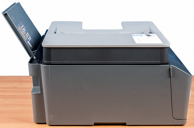 Приемный лоток горизонтальный, выдвижной, он расположен в нижней части передней панели. Таким образом, изгиб листа при проходе через механизм аппарата относительно небольшой, что как раз и позволяет работать с носителями повышенной плотности, в том числе с бумагой для струйной фотопечати.