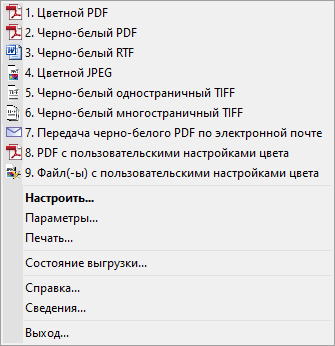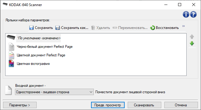 На первой странице отображаются предустановленные профили сканирования (можно добавлять и собственные), а из оперативных установок только задание двух- или одностороннего режима (с выбором: лицевая сторона — та, что прилегает к лотку, или обратная, которая видна оператору).
