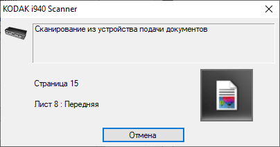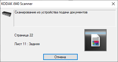 На цифровом индикаторе сканера при этом ничего не отображается, лишь подсветка кнопки сканирования постоянно горит зеленым. На компьютере присутствует окно с подсчетом листов и сторон.