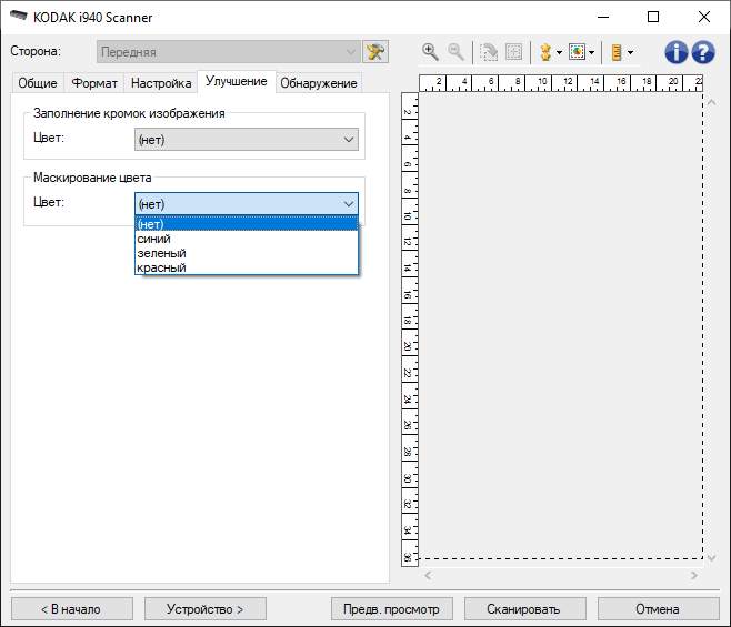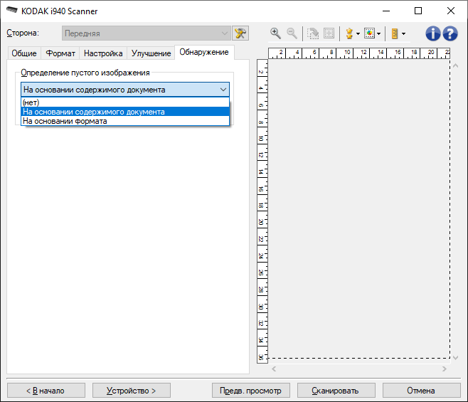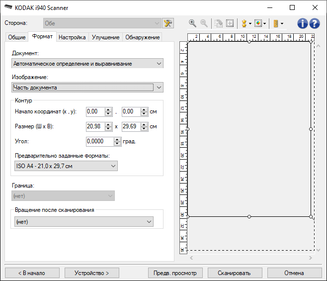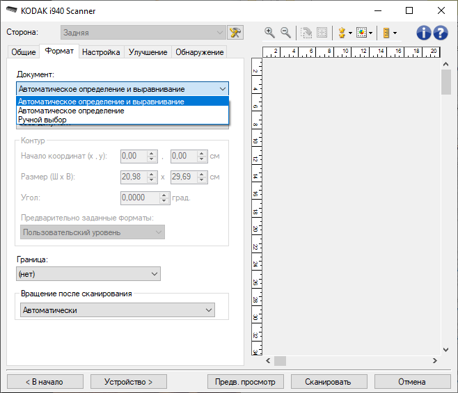 В настройках сканирования следует задать автоматическое определение документа (лучше с выравниванием).