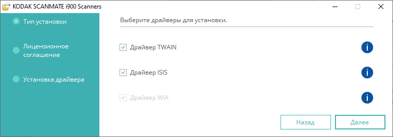 Драйвер WIA устанавливается обязательно, а TWAIN и ISIS можно исключить. Поскольку приложений, поддерживающих ISIS, у нас не было, мы оставили только TWAIN.