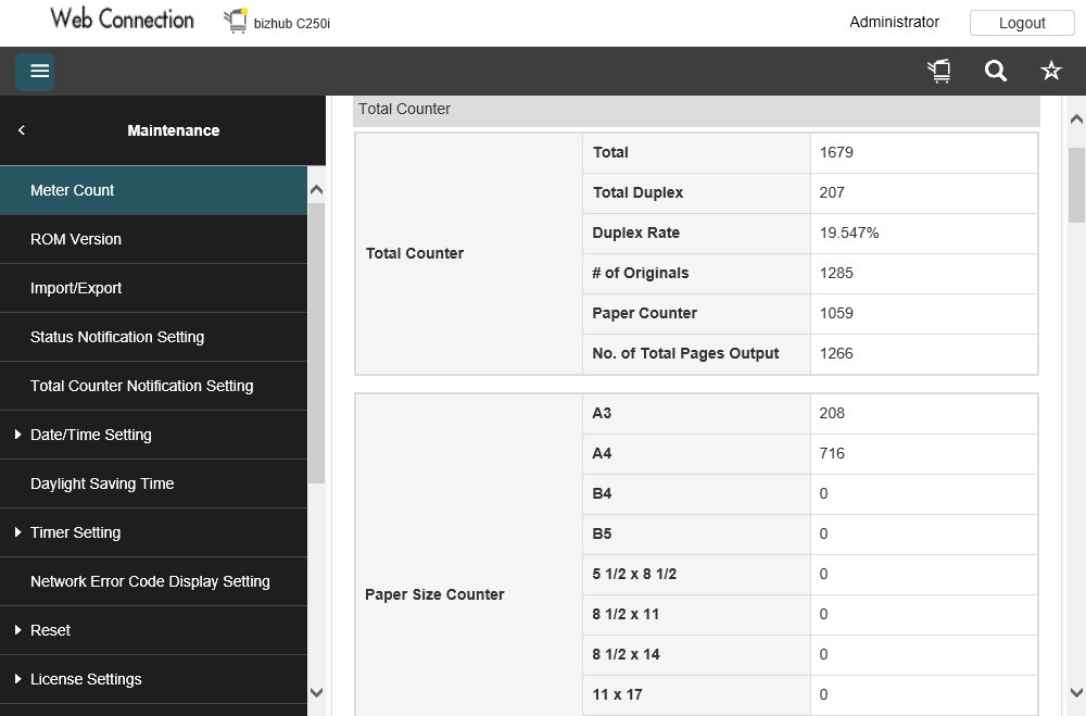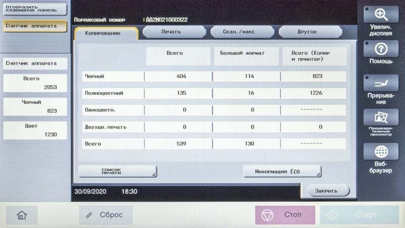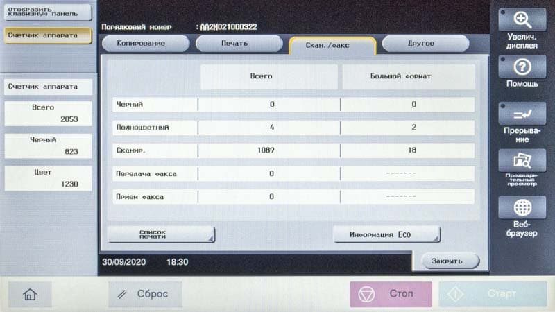 Имеются очень подробные счётчики наработки, фиксирующие самые разные действия: копирование, печать, сканирование (и факс — при наличии такой опции), раздельно цветное, монохромное, большого формата и с использованием дуплекса.