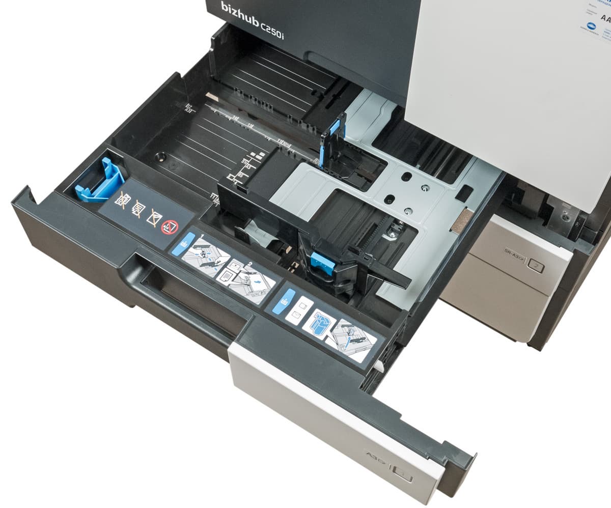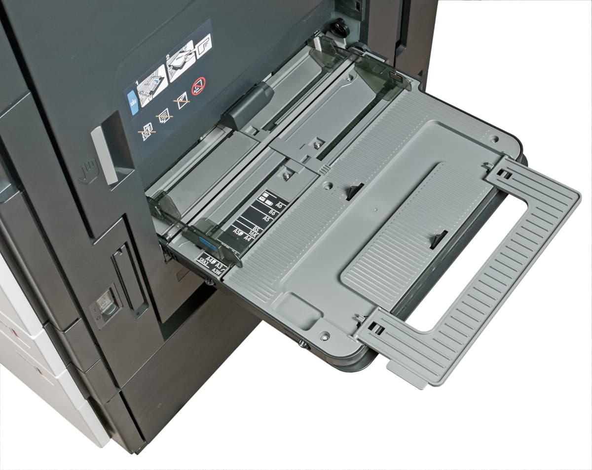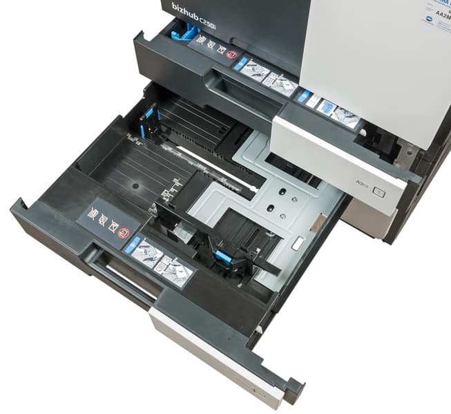 Штатных подающих лотков три. Два их них выдвижные: верхний (с номером 1) рассчитан на форматы А3 и менее, а в нижний (номер 2) можно укладывать и бумагу SRA3; оба вмещают по 500 листов.