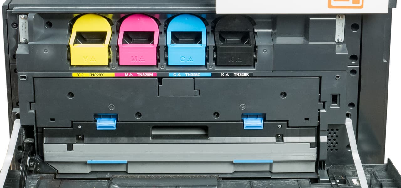 - тонер-картриджи: черный TN-328K и цветные TN-328С/M/Y, рассчитанные на 28000 отпечатков при заполнении 5% (можно купить комплект TN-328CMYK, который обойдётся немного дешевле);