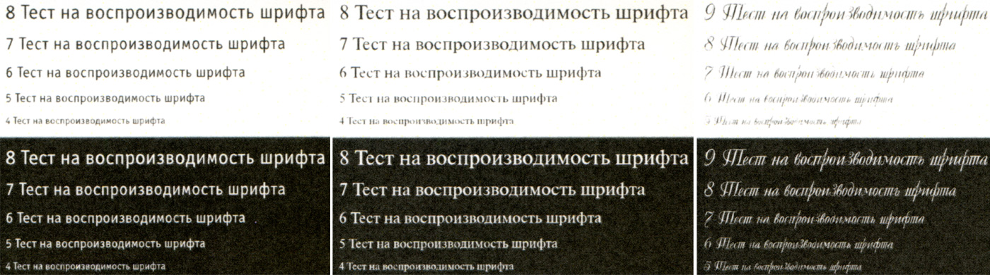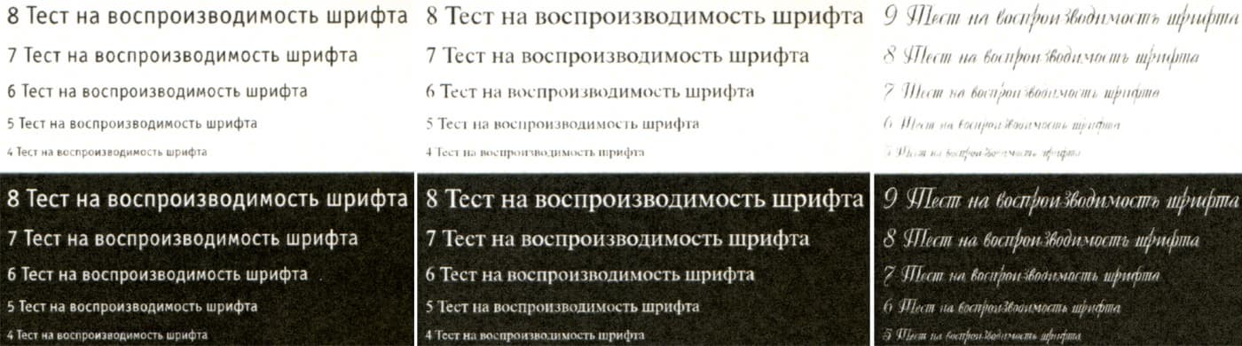 На текстовых полях при печати нормальной и вывороткой шрифты с засечками и без читаются от 4-го кегля, у декоративного шрифта читаемость начинается от 8-го кегля нормальный и вывороткой.