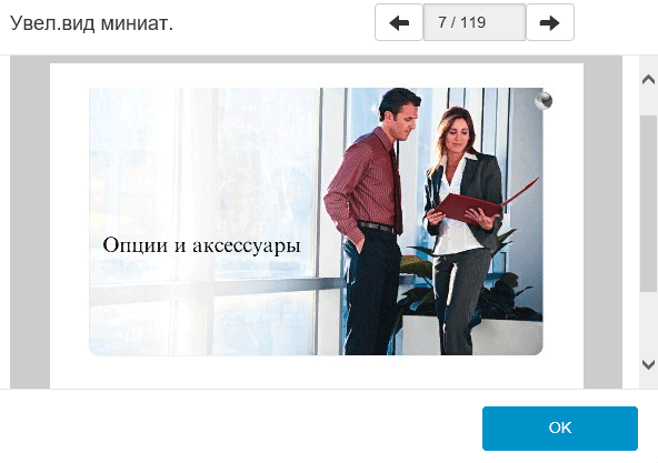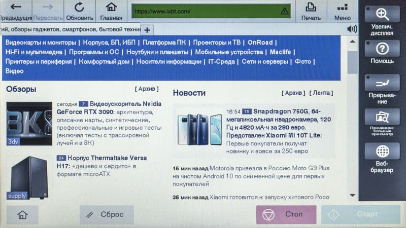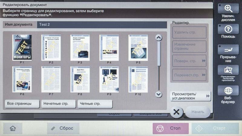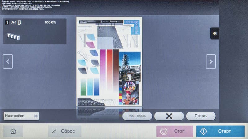 Редкостью является возможность предварительного просмотра скана документа (в т.ч. многостраничного с АПД) перед изготовлением копии, причём предусмотрено увеличение картинки и оперативное изменение некоторых настроек.
