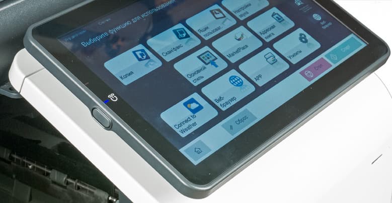 Панель закреплена на шарнире, позволяющем поворачивать ее из вертикального положения на угол до 55-60 градусов. Этого вполне достаточно для удобной работы с МФУ, даже установленного на подставку или модуль кассетной подачи, при любом положении оператора — стоя или сидя. При этом панель не выступает за габариты самого аппарата, что уменьшает риск повредить её при перемещениях.