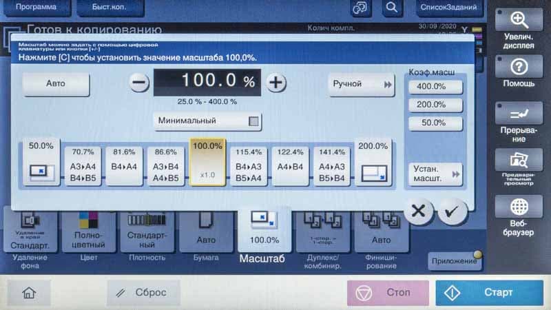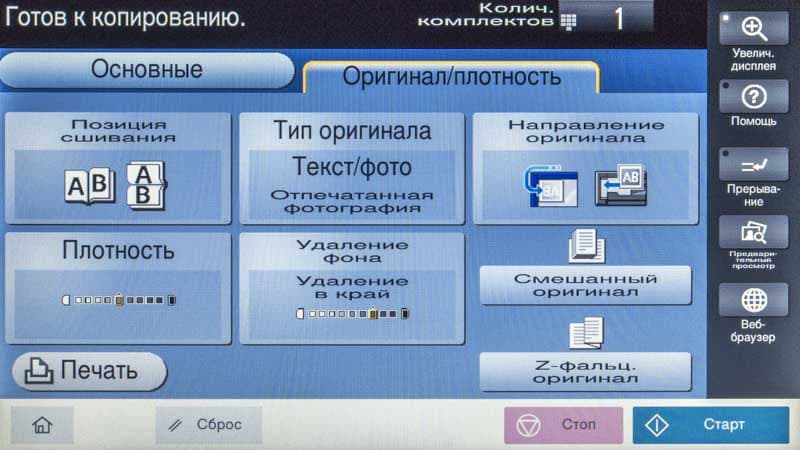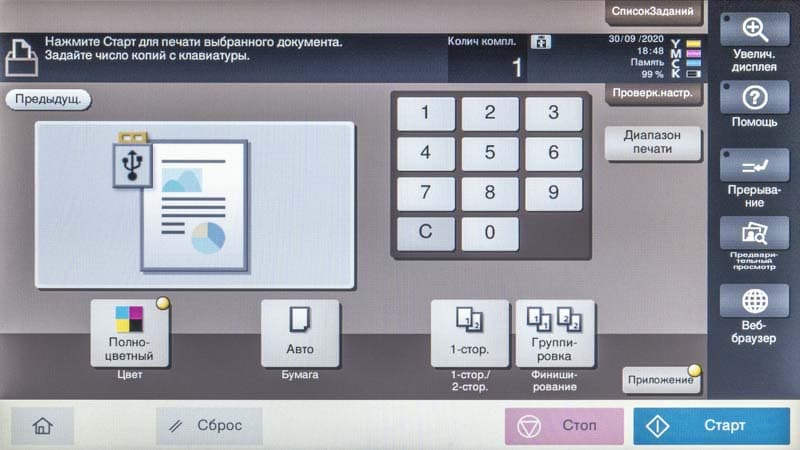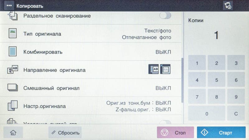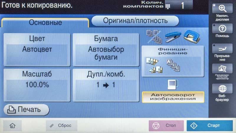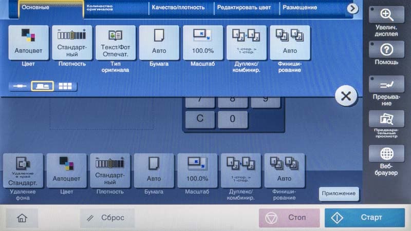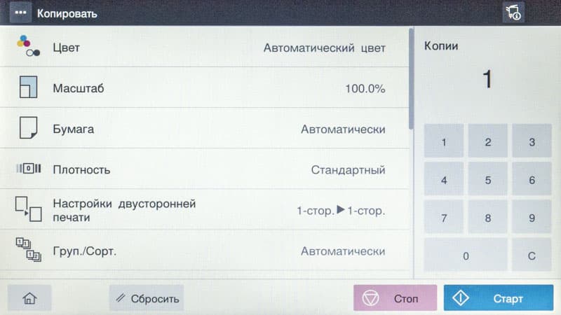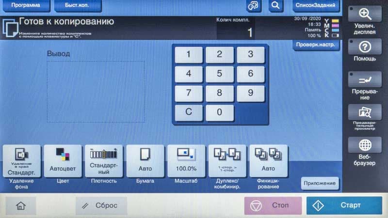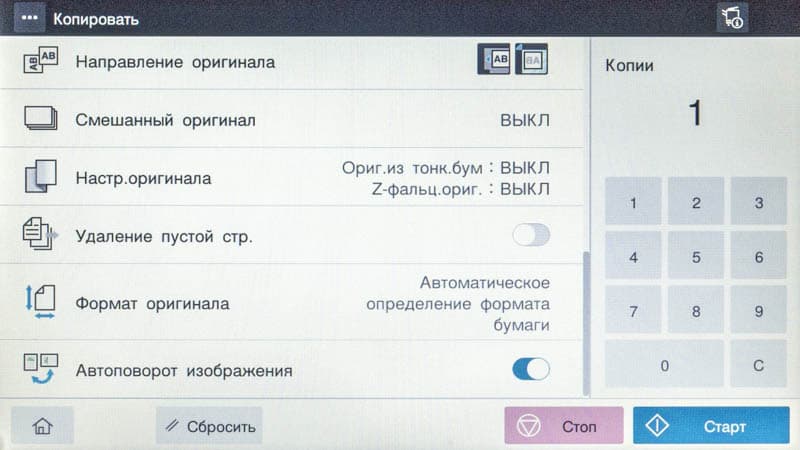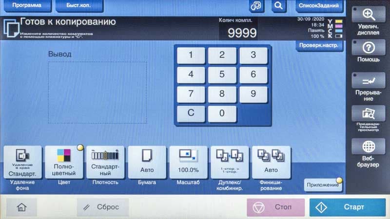 Количество копий вводится с помощью экранной клавиатуры вплоть до 9999 (именно так: десять тысяч без одной; и здесь надо напомнить, что даже при наличии всех соответствующих опций максимальная вместимость подающих и приёмных лотков существенно меньше этого значения).