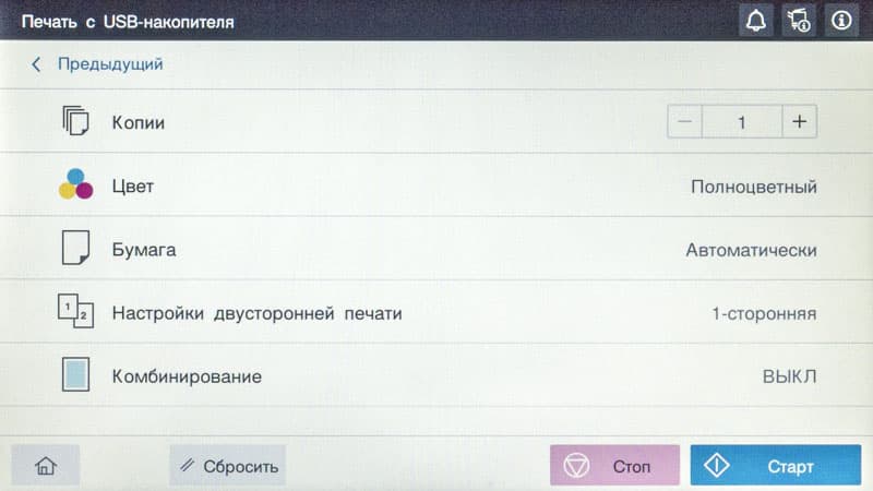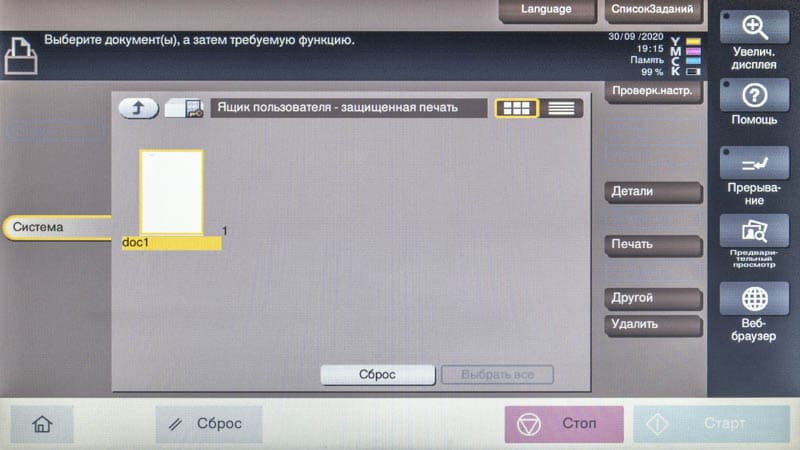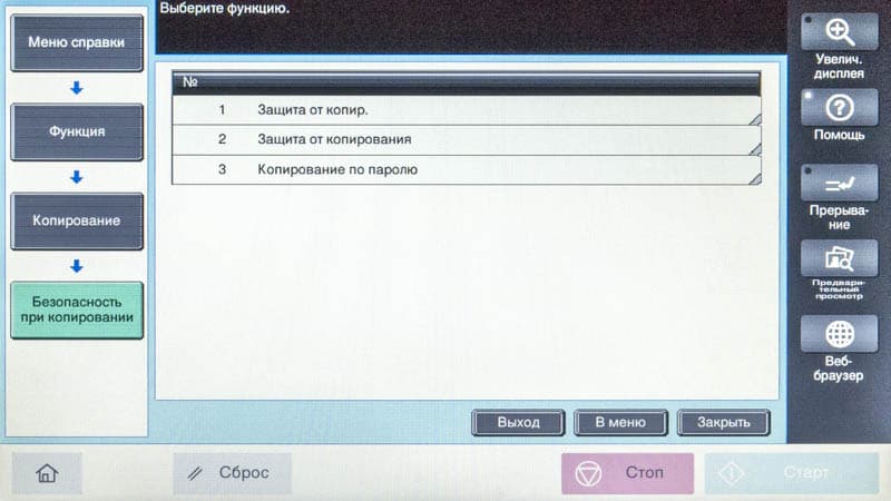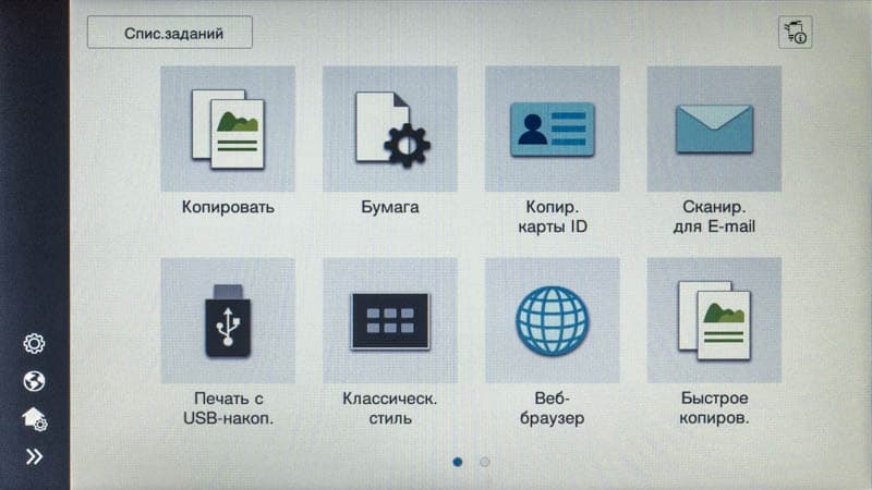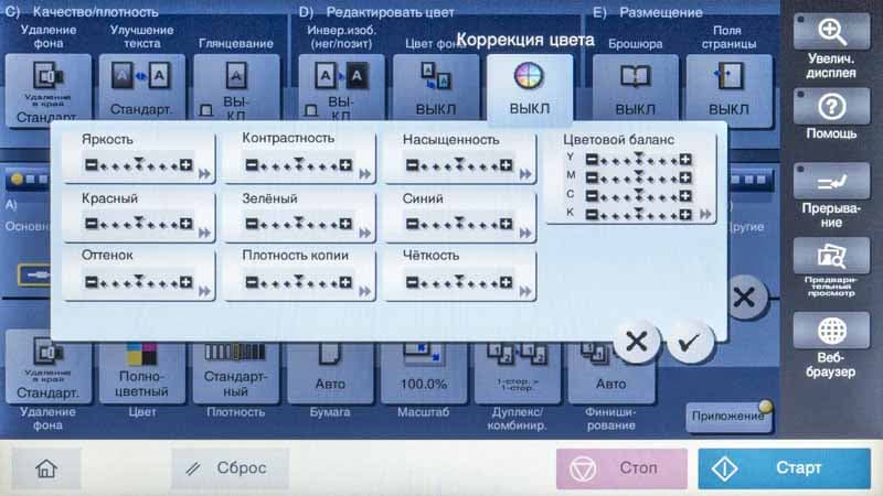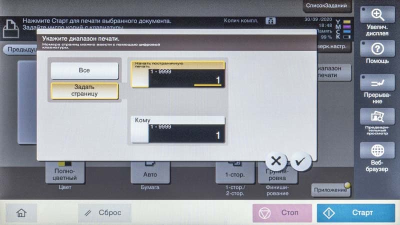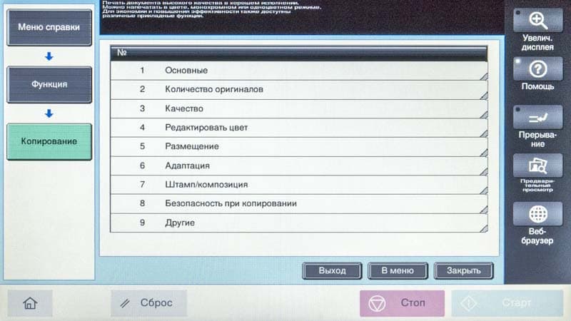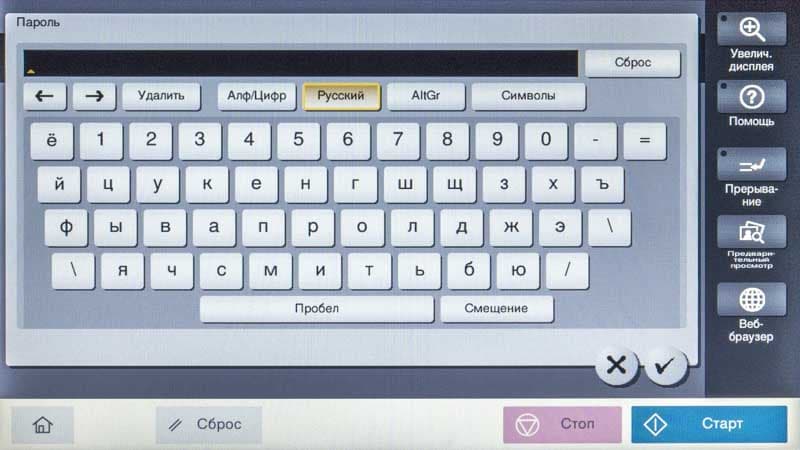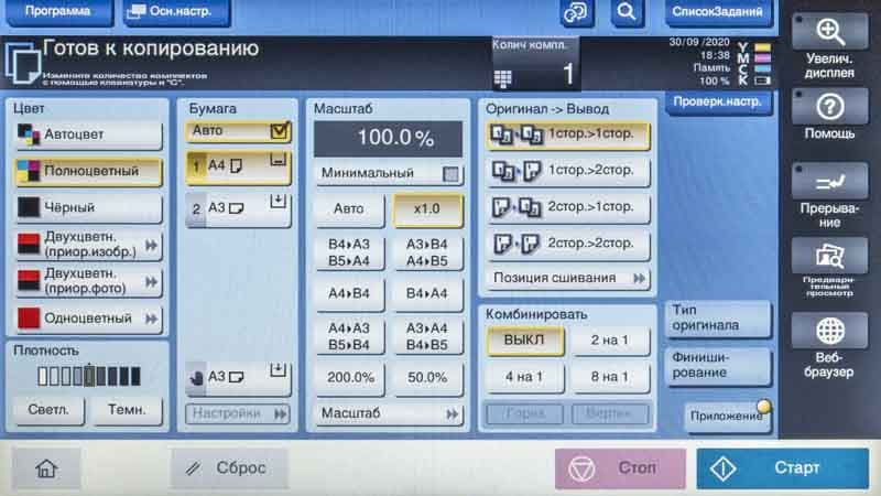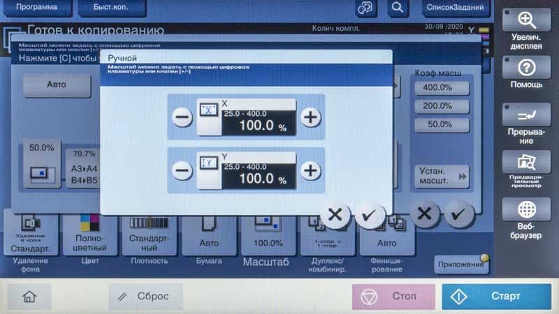 Количество копий вводится с помощью экранной клавиатуры вплоть до 9999 (именно так: десять тысяч без одной; и здесь надо напомнить, что даже при наличии всех соответствующих опций максимальная вместимость подающих и приёмных лотков существенно меньше этого значения).