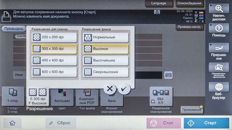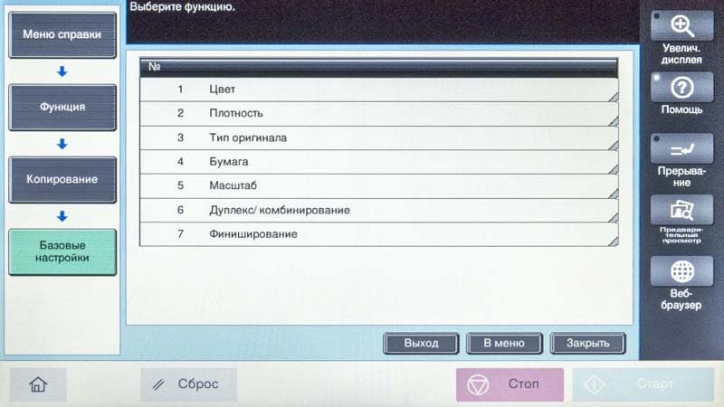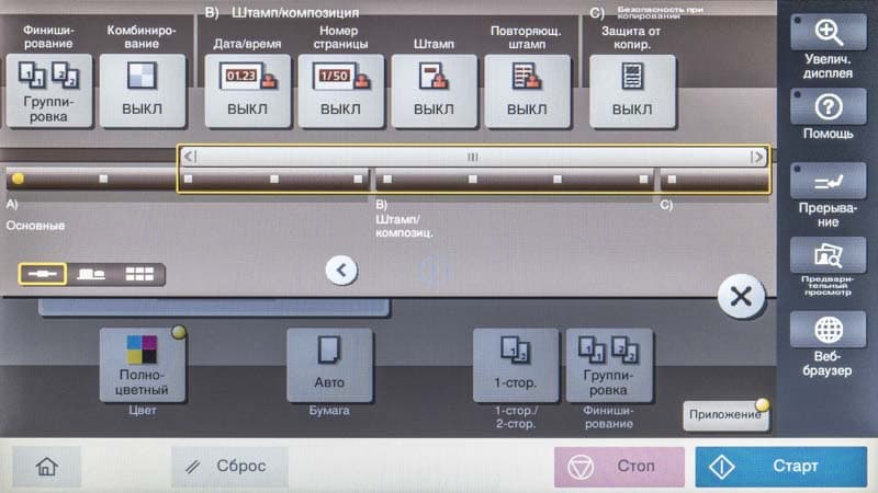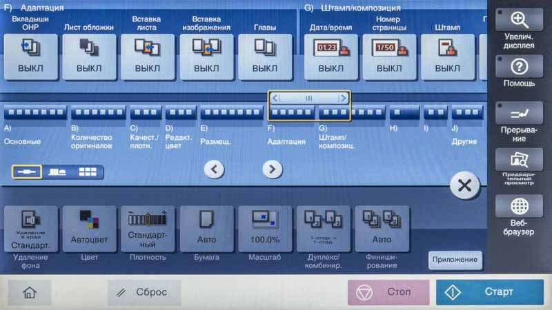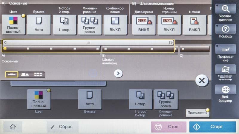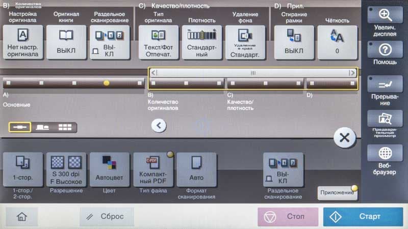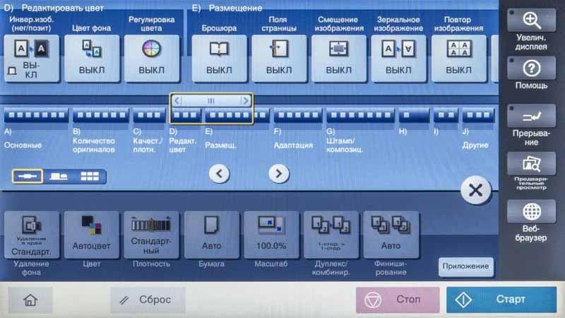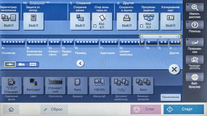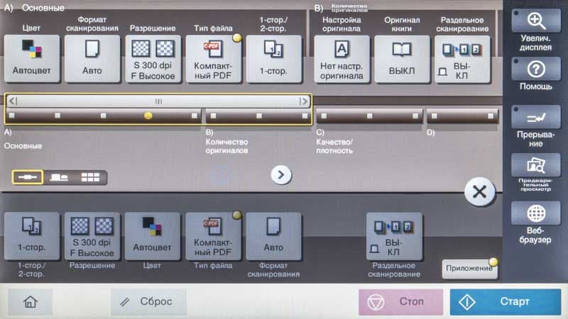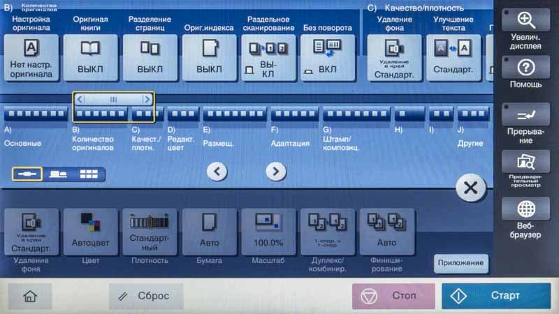Набор прочих доступных на этом экране параметров копирования вполне обычный: масштабирование, плотность, финишная обработка, задание количества сторон оригинала и копии, выбор лотка. Расширенный список появляется по нажатию кнопки «Приложение» (перечень длинный, поэтому для него предусмотрены три режима отображения, которые можно выбирать по своему вкусу).
