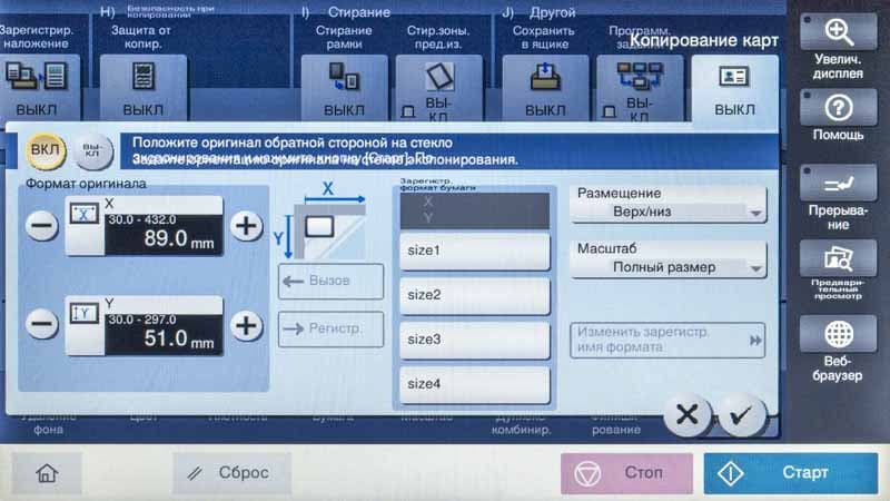 Есть режим копирования ИД-карточек, то есть небольшого размера двусторонних или многостраничных документов. С его помощью, например, очень удобно копировать два разворота паспорта на один лист. В отличие от многих других подобных аппаратов, предусмотрена масса настроек для форматов таких оригиналов, их масштабирования и размещения на копии, которые можно сохранять для использования впоследствии.
