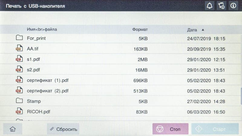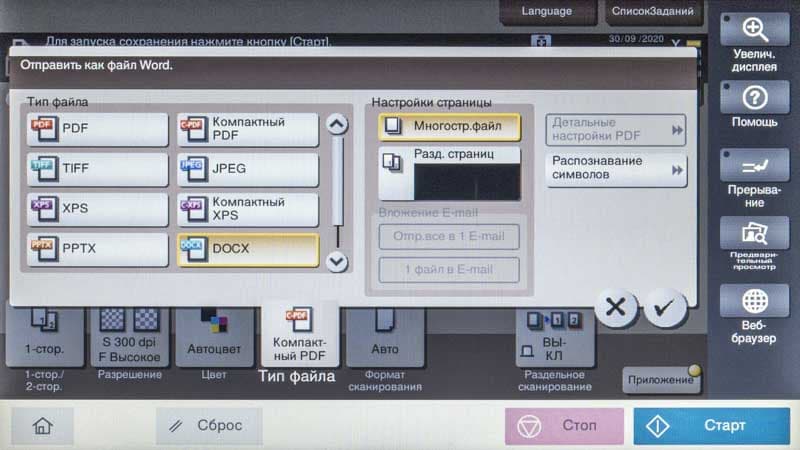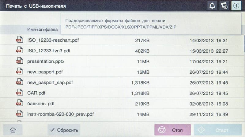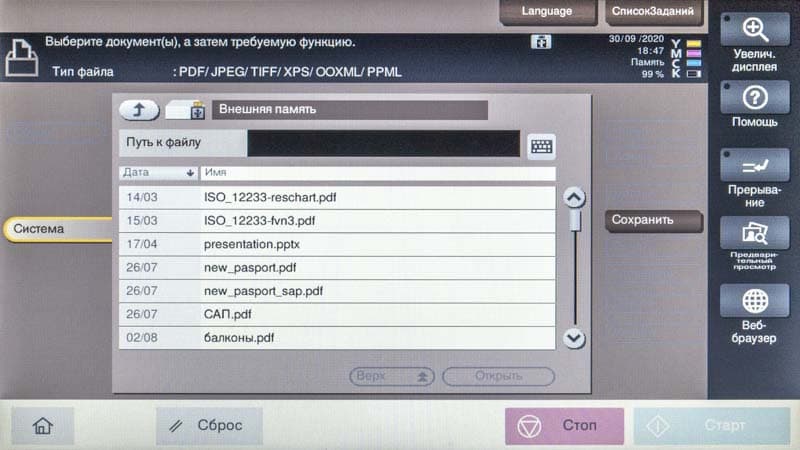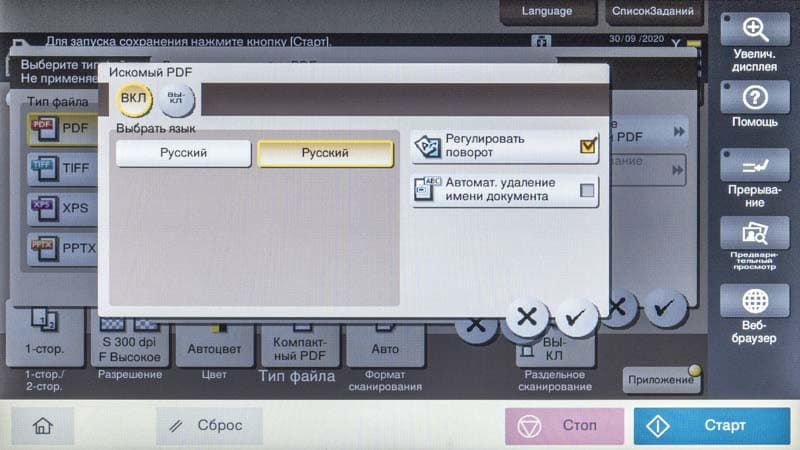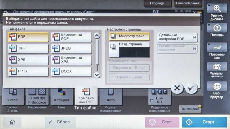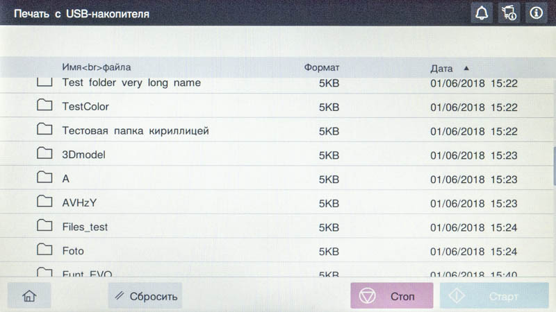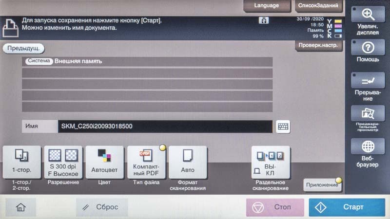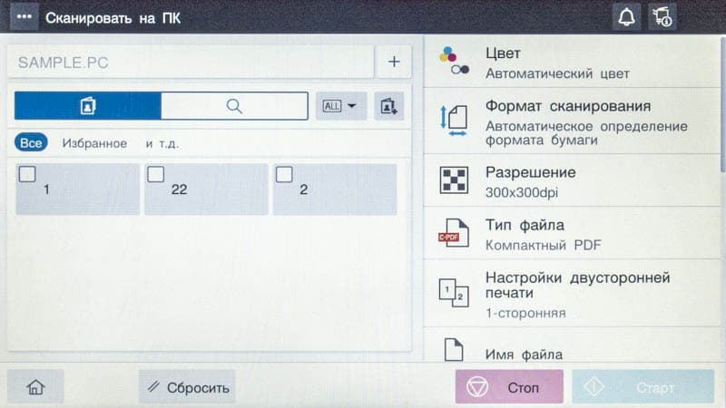 Для работы с USB-флешек задавалось сохранение в виде многостраничного PDF-файла (без OCR и иных дополнительных установок), тип оригинала «Текст», время замерялось от нажатия кнопки «Пуск» до окончания записи файла, при сканировании с компьютера — от старта кнопкой приложения до появления последней страницы в его окне.