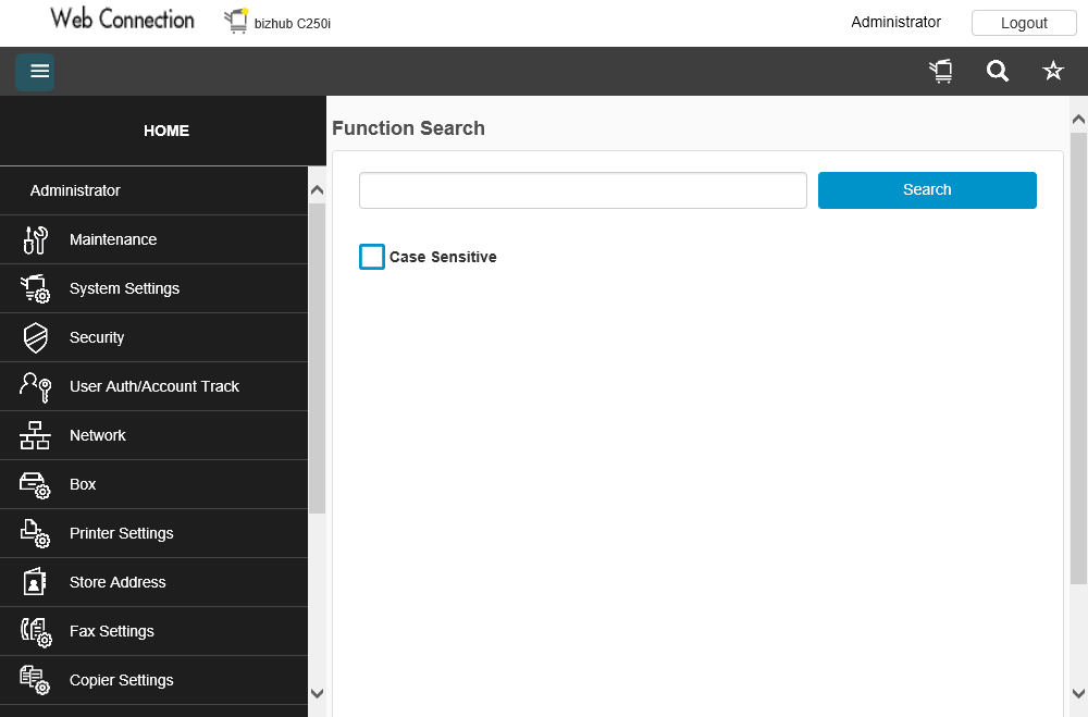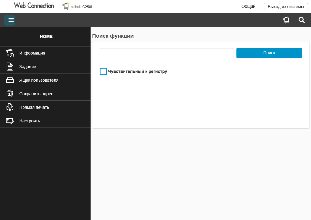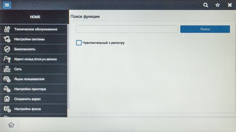 Если задействованы идентификация пользователей или отслеживание учётных записей, при включении аппарата появится окно входа в систему, где требуется ввести имя и пароль. Тогда в правом верхнем углу домашней страницы появится дополнительная иконка, нажатием которой можно посмотреть текущее имя и выйти для смены.