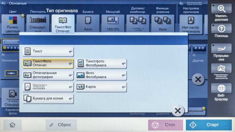 На домашней странице основного стиля есть две кнопки: «Классическое копирование», окно которого соответствует описанному выше, и просто «Копирование» с окном не только другого внешнего вида, но и с иным набором настроек, которое, в частности, включает и выбор типа оригинала из восьми вариантов.