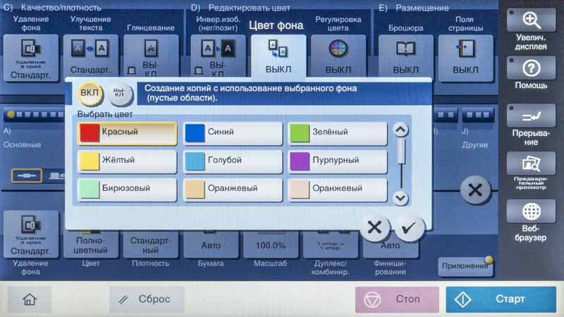 Пустые (белые) места на копии можно «залить» каким-либо цветом с выбором из восемнадцати вариантов — получается весьма занятно, в отсутствие цветной бумаги может быть ещё и полезно (если, конечно, дополнительный расход тонера не смущает).