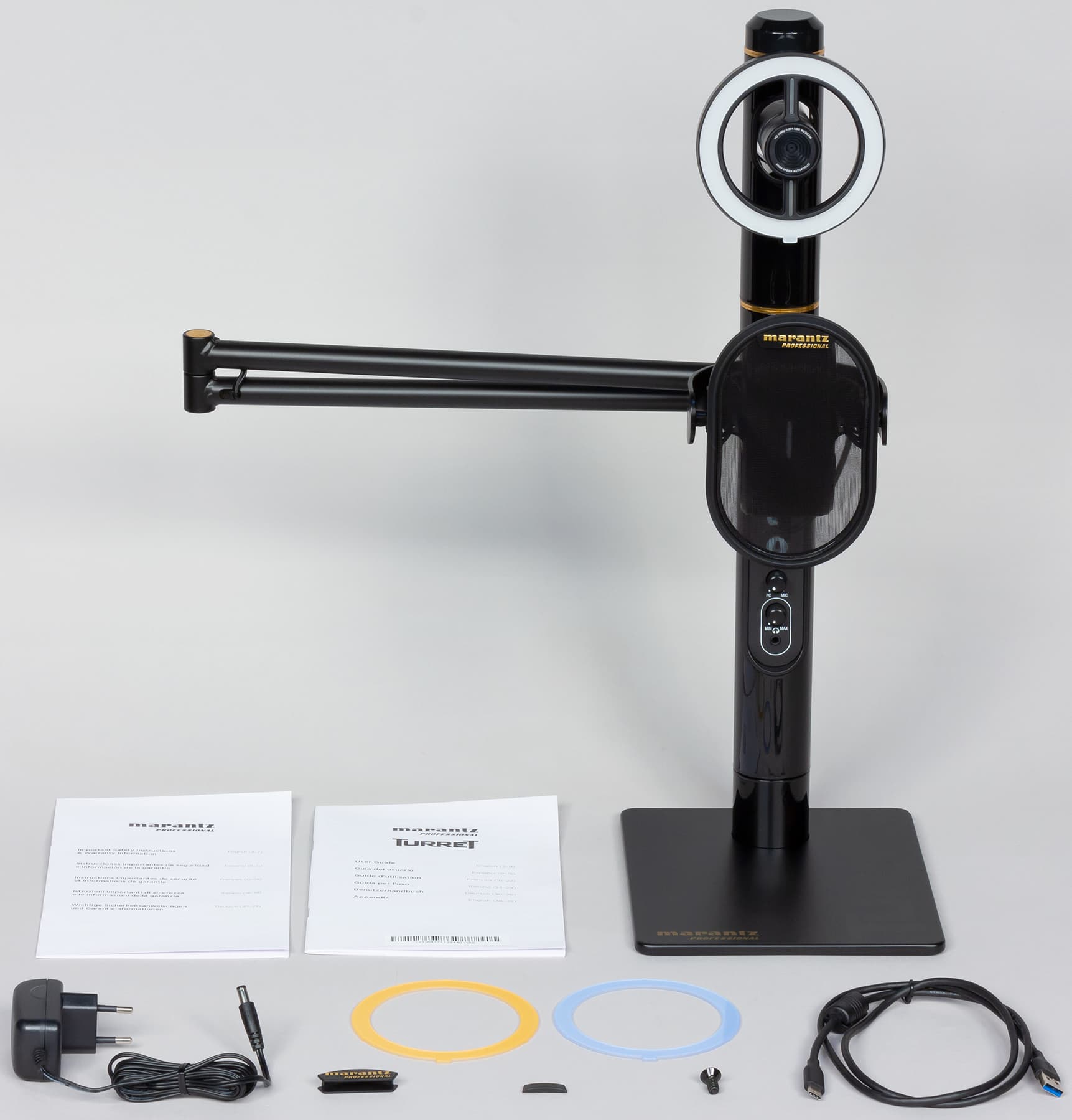 Marantz Professional Turret — комплексная система для проведения трансляций и стримов. Она включает камеру с автофокусом и кольцевой LED-вспышкой с возможностью регулировки цветовой температуры, конденсаторный микрофон с поп-фильтром на подвижной штанге и удобную панель управления системой.