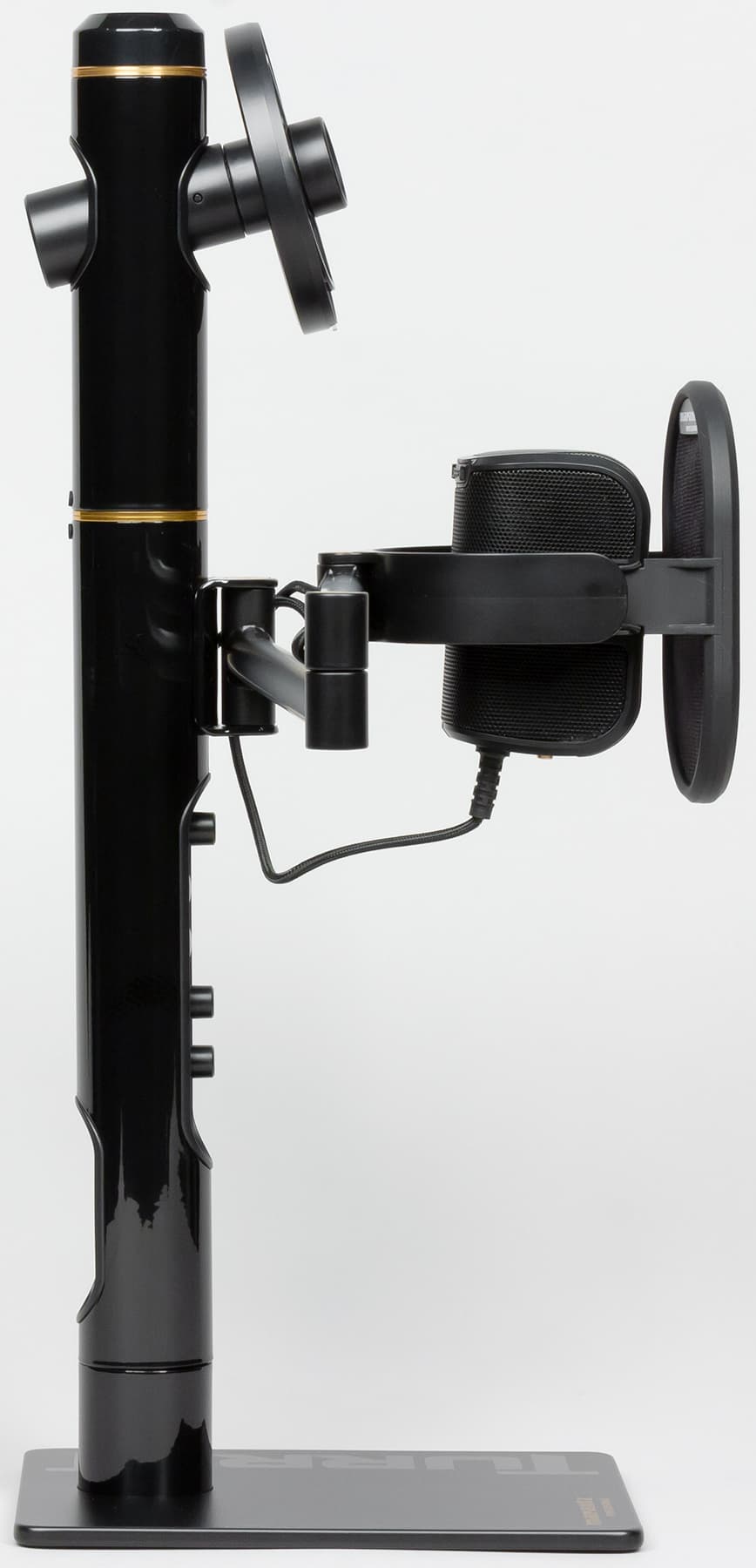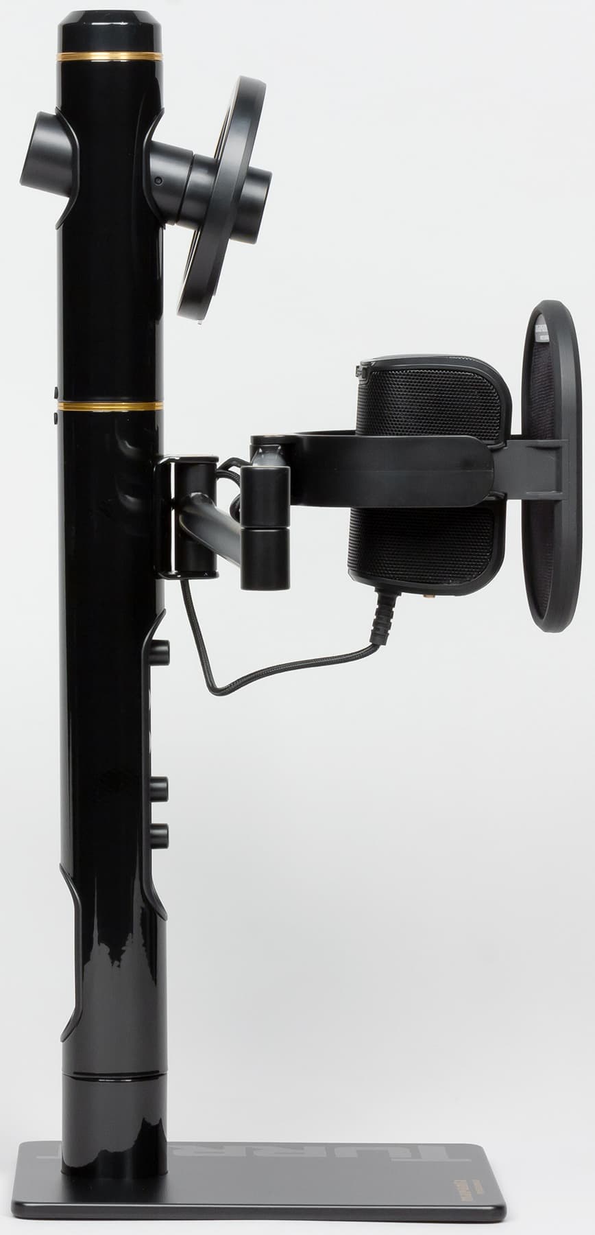 Под штангой микрофона, на фронтальной части цилиндра, находится панель управления системой. Здесь есть: регулятор подсветки, клавиши включения камеры и микрофона с подсветкой, регулятор баланса звука в наушниках, регулятор громкости наушников, выход 3,5 мм для подключения наушников. Регуляторы обладают плавным и чуть упругим ходом. У клавиш включения микрофона и камеры — средний ход и отчетливый щелчок. Все элементы управления снабжены подписями или индикаторами, что делает эксплуатацию системы простой даже без чтения инструкции. Элементы управления расположены удобно.
